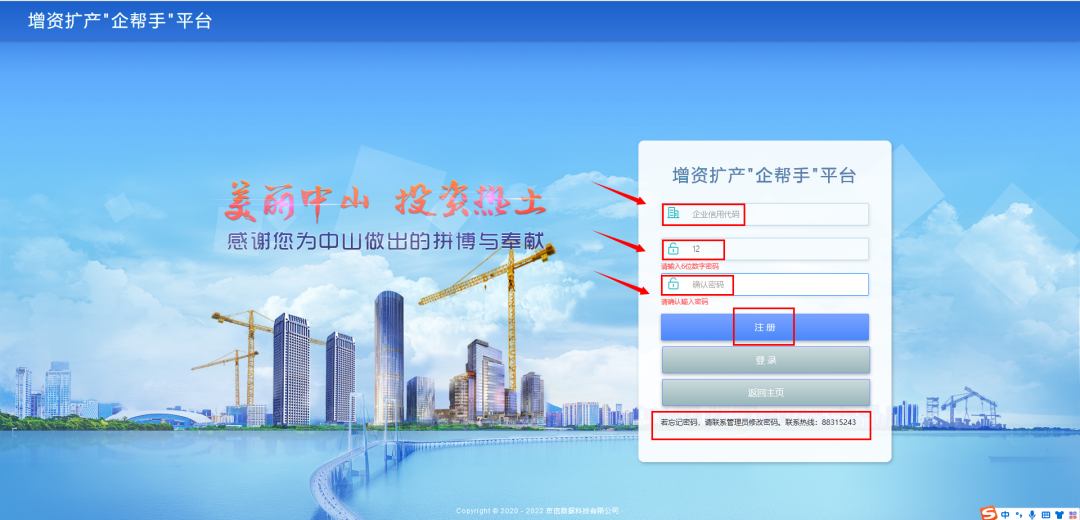 1、注册:企业可以通过填写企业信用代码以及设置密码(密码为6位数字)的方式完成对该平台的信息注册。