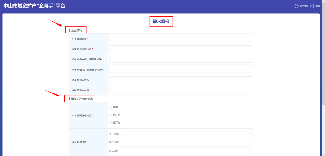 3、企业需求填报:登录之后,点击首页的“我有需求”,进入“需求填报”页面,完成企业情况和增资扩产项目需求这两部分的信息填写之后可进行需求的提交,其中带*的表示必填项。