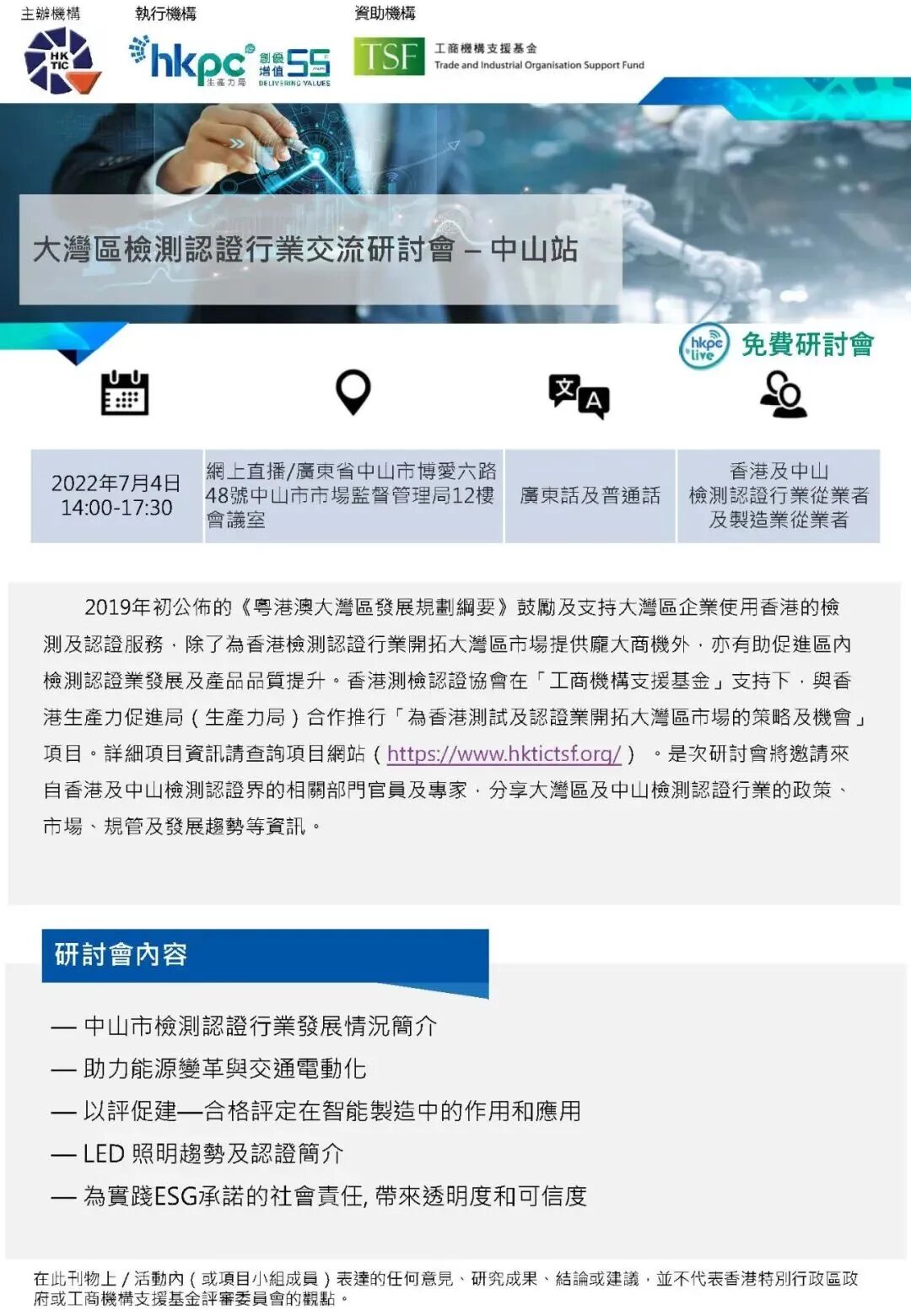 为推动香港检测认证机构融入大湾区市场,构建大湾区检测认证行业优势互补、融合发展、协作共赢的生态体系,协助大湾区产品“走出去”,促进大湾区经济社会高质量发展,将于7月4日举办大湾区检测认证行业交流研讨会-中山站活动。