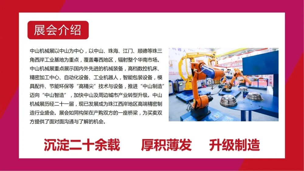 2022第二十二届中山机床模具及塑胶机械展览会暨2022第八届中山工业自动化及机器人装备展览会(简称:中山机械展)即将举行。本届展会重点展示国内外先进的机械装备,高档数控机床、精密加工中心、自动化设备、工业机器人,智能包装设备,模具配件、节能环保等“高精尖”技术与设备,现组织会员企业前往参观。