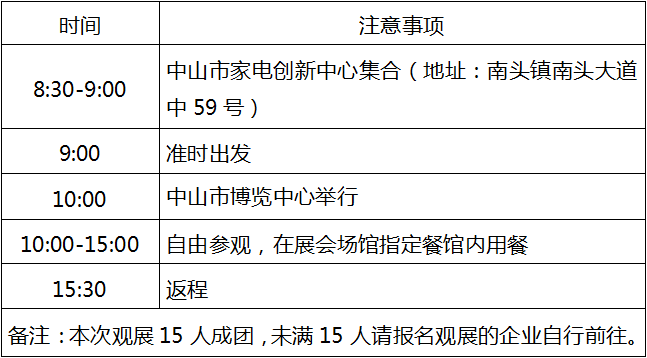 本次活动免费,含午餐。请有兴趣参加的企业于6月15日16:00前填妥《报名回执》后回复至协会秘书处。《报名回执》请点击下方“阅读原文”进入协会官网下载,或关注“中山市家用电器行业协会”公众号后直接回复“主题+企业名称+姓名+职务+手机”(如:参观2022第二十二届中山机床模具及塑胶机械展+中山市XXX有限公司+赵XX+经理+139XXXX)