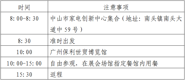本次活动免费,含午餐和专车往返。请有兴趣参加的企业于9月1日16:00前填妥《报名回执》后回复至协会秘书处。《报名回执》请点击下方“阅读原文”进入协会官网下载,或关注“中山市家用电器行业协会”公众号后直接回复“主题+企业名称+姓名+职务+手机”(如:IEAE广州国际电子及电器博览会+赵XX+经理+139XXXX)