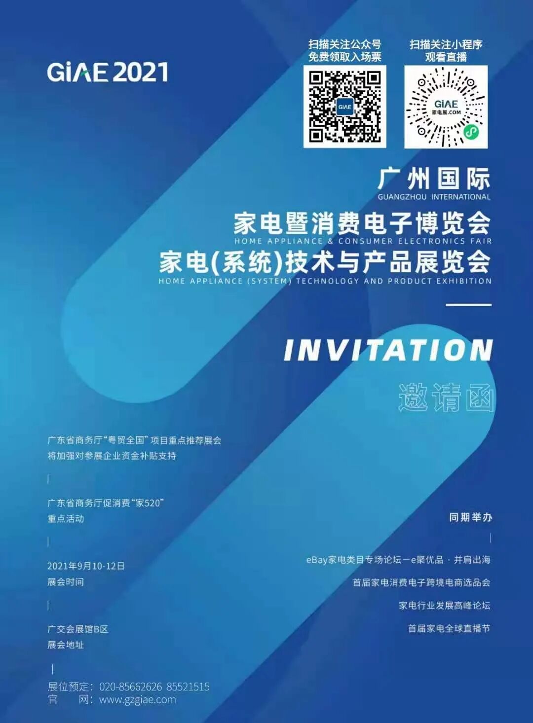 广州国际家电暨消费电子博览会|家电(系统)技术与产品展览会将于2021年9月10-12日在广交会展馆B区举办。本次博览会将重点围绕智能家电产品设计,智能人居系统,未来家用电器及个人电子类产品的消毒杀菌功能,家用电器火灾预警功能、上下游产业链等主题,展示5G+、人工智能、移动互联网、物联网、云计算、大数据等前沿技术与家电消费电子行业深度融合的最新成果。现组织会员企业参展,有关事项通知如下: