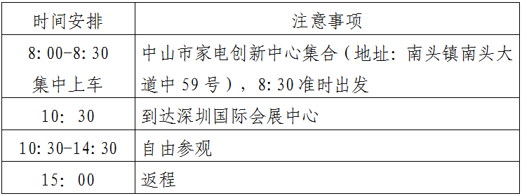 本次活动免费,含专车往返。请有兴趣参加的企业于7月30日16:00前填妥《报名回执》后回复至协会秘书处。《报名回执》请点击下方“阅读原文”进入协会官网下载,或关注“中山市家用电器行业协会”公众号后直接回复“主题+企业名称+姓名+职务+手机”(如:华南国际工业自动化展览会+赵XX+经理+139XXXX)