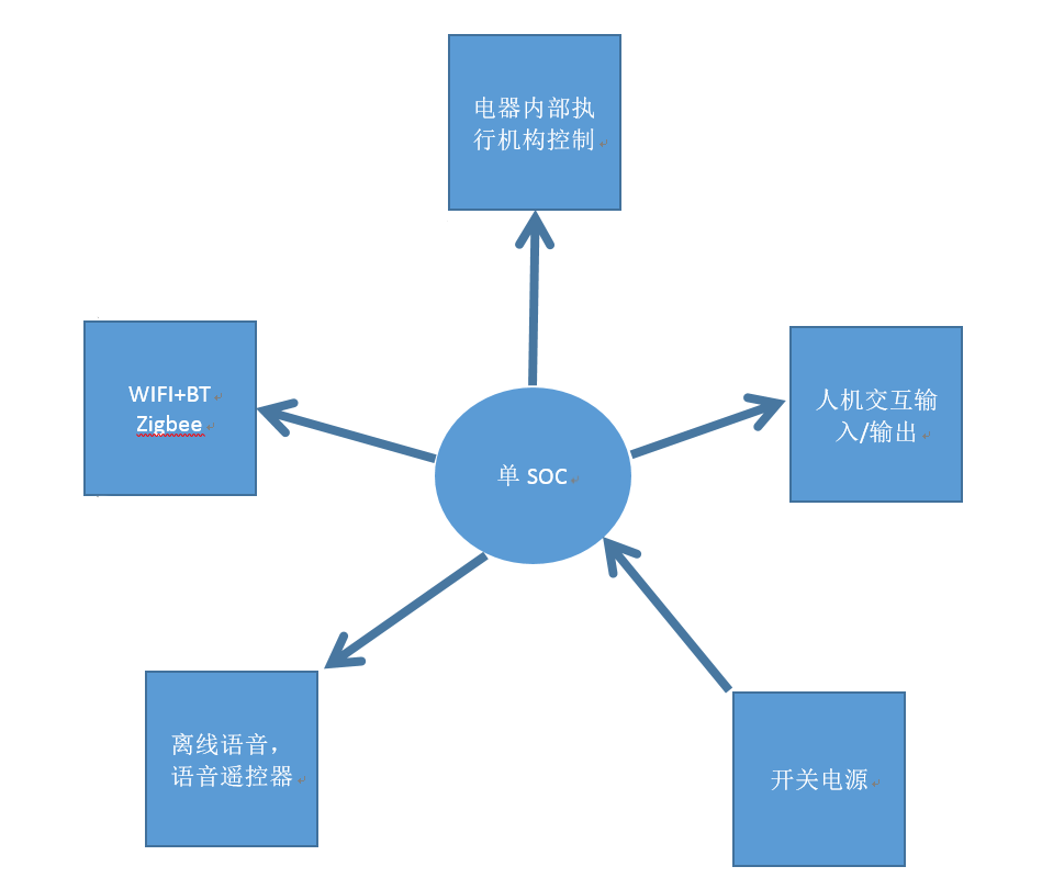 传统的智能家电方案以模块化设计,通过串口将各模块之间连接,各个模块需要单独的MCU去控制,大部分的MCU功能没有得到充分利用,不仅增加了硬件成本,使用效率也较低。且模块由不同厂商提供,增加了联调联试的时间成本。