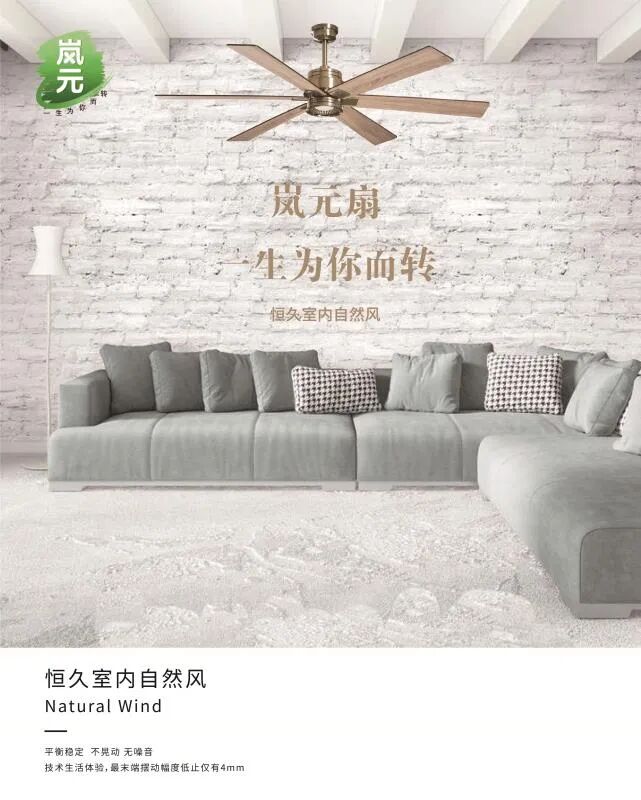 技术护航 安全稳定产品安全是人们最关注的问题。就在市场上普遍还在通过增加平衡块来调整产品的平衡时,岚元已经早就通过产品设计和工艺控制来从技术源头实现这一功能,它采用纯铜线圈绕制的矽钢片电机,精密制造,不晃动,无抖动。据测试即使是15厘米的吊杆风扇,在高速运转时中心位移也不差过4毫米,已经远远超过行业标准达到业界顶尖水平。 告别“空调病”减轻消费者对空调综合症的反应,避免冷气集中朝一个方向吹,由于出风面积有限,股状出风,让你不是头热脚冷就是左冷右热并且皮肤干燥。现搭配岚元扇一起使用,凉意覆盖每个角落,冷气非常均匀。皮肤也润润的,一点也不紧绷,特别适合幼儿、孕妇、体弱多病等人群。爸妈再也不用担心空调太冷而头疼关节痛了。 告别“巨耗能”采用纯铜机芯导热性更好,散热更快,高精度轴承,严密把控品质精密组合,从材料技术上做到环保节能,结合空调使用室温降得更快,只需3分钟,就能感到清凉舒服,有效减少空调压缩机的工作时间和频率,可节能30%;单独使用按最低功率3W,一天24小时运转,每度电0.7元算,日电费低至0.05元,超出你想象,就是这么省。 风扇改善了风的质量,而风的质量提升了生活的品质。目前我们的产品已经广泛应用在居家、餐厅、学校、医院等领域,未来越来越向多元化、智能化、定制化方向发展。 现如今,疫情当下,通风换气成了室内活动的重要指标,岚元扇也越来越多已出现在人们工作生活、娱乐休闲等多个公共场所,营造了一个个通风清爽、舒适健康的空间,实现了人们追求健康自然的生活品质。 岚元扇,风与美的当代塑性,引领恒久室内自然风,岚元始终心怀维护地球生态平衡的大爱理念,怀着人们对自然风追求和品质健康生活交融的社会责任感,岚元扇愿担负起健康生态的责任,付出我们的爱,真正把了节能环保、绿色健康,自然舒适的健康节能产品带到千家万户,为人类的健康生活和自然生态发展贡献力量,创造更加美好的人居未来!