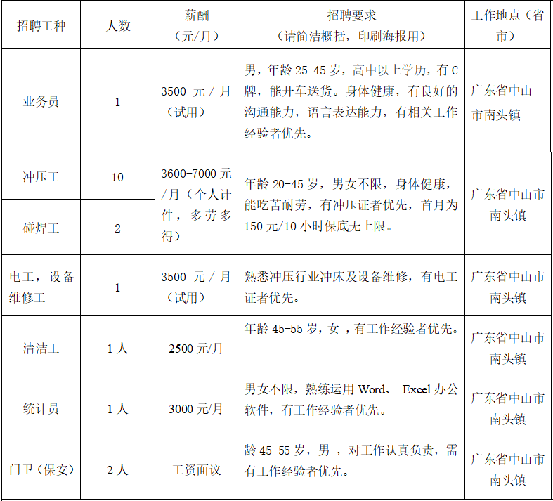 中山市通力电器有限公司位于经济繁荣,交通便利的珠江三角洲黄金腹地—中山市南头镇,成立于二000年,主要生产制造各类空调室内外箱体、各种家电金属壳体、大型钣金件冲压成型等,是国际众多知名品牌空调钣金件的主要生产制造商。由于当前我司增加了大量的生产设备,客户订单增加、生产量扩大需大量人员加盟。