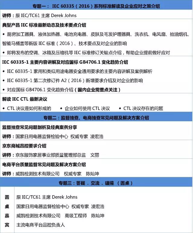 -- 成功的经验大多相似,失败的原因却千差万别。作为原IEC/TC61主席,Derek Johns接触到全球IEC60335系列标准执行中的各式案例。与此同时,日用电器监督检验中心以及威凯检测技术有限公司常年承担政府监管部门以及电商平台的监督抽查任务,丰富的经验以及数据足以帮助企业破解各种产品质量方面的疑难杂症。