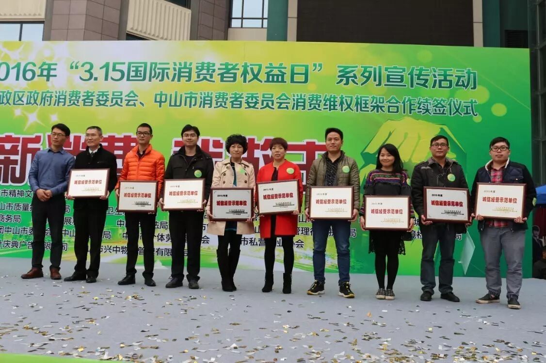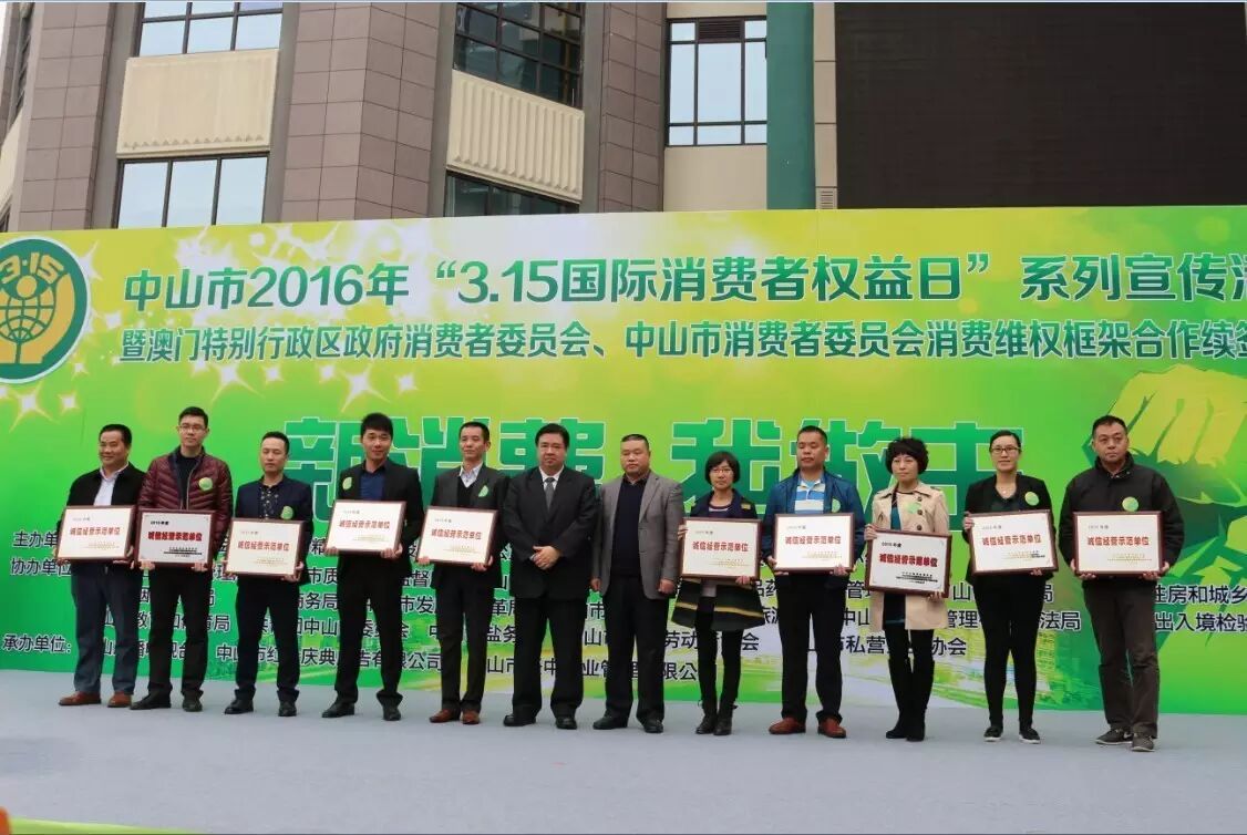 在“3·15国际消费者权益日”系列宣传活动中,广东省消委会副会长兼秘书长罗卫光、市政府副秘书长陆德华、澳门消委会执委会主席黄翰宁、市工商局局长李德荣、市委宣传部副部长兼市文明办主任彭晓新、市消委会会长王乐军、市发改局总经济师兼市信用办主任方劲松以及相关职能部门领导为荣获“2014-2015年全国消协组织消费维权先进集体、先进个人”、“中山市消费维权积极贡献单位”、“中山市最美维权人物”、“2015年度中山市诚信经营示范单位”及“连续三年中山市诚信经营示范单位”称号的企业和个人分别颁发了牌匾和证书。