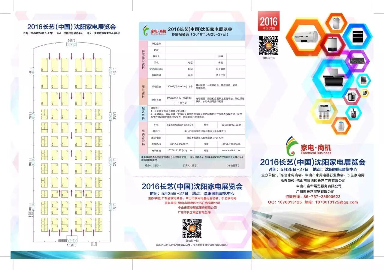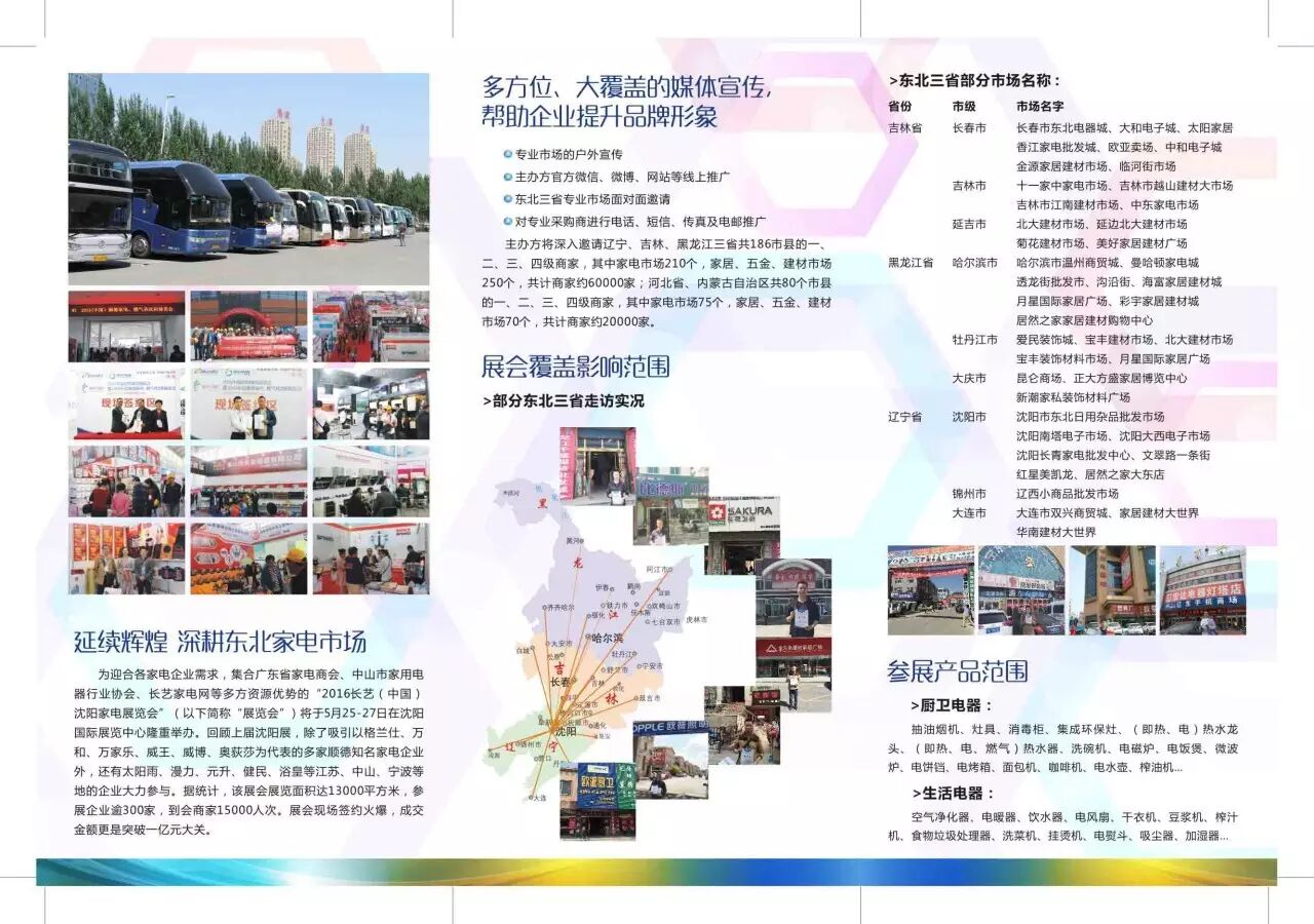 为迎合各家电企业需求,深耕东北家电市场,我会联合广东省家电商会、顺德家电商会、顺德燃气具商会、长艺家电网等共同举办2016长艺(中国)沈阳家电展览会。展会面积达13000平方米,参展企业逾300家,将邀请辽宁、吉林、黑龙江、河北省、内蒙古自治区共200多市县的各级经销商,包括家电市场、家居、五金、建材等商家。多方位、大覆盖的媒体宣传,帮助企业提升品牌形象、达到深耕开拓、精准购销、互惠共赢的最佳效果。