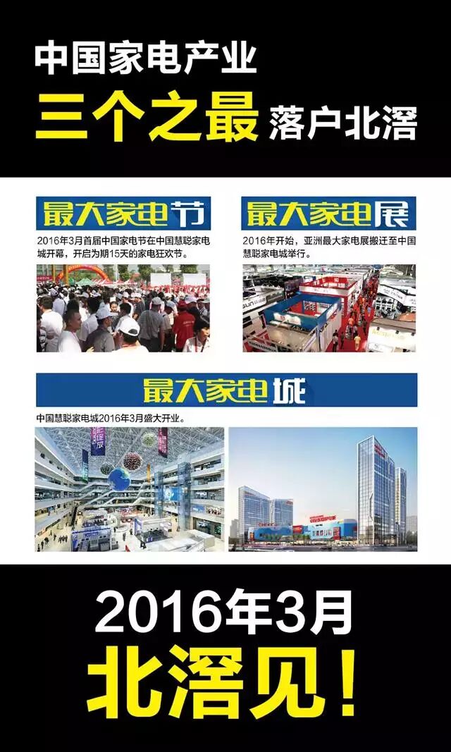 2016年,中国家电产业“研发设计中心、交易金融中心、电子商务中心、贸易会展中心、家电人才中心”和 “最大家电节、最大家电展、最大家电城”,“五个中心”和“三个之最”将落户北滘。
