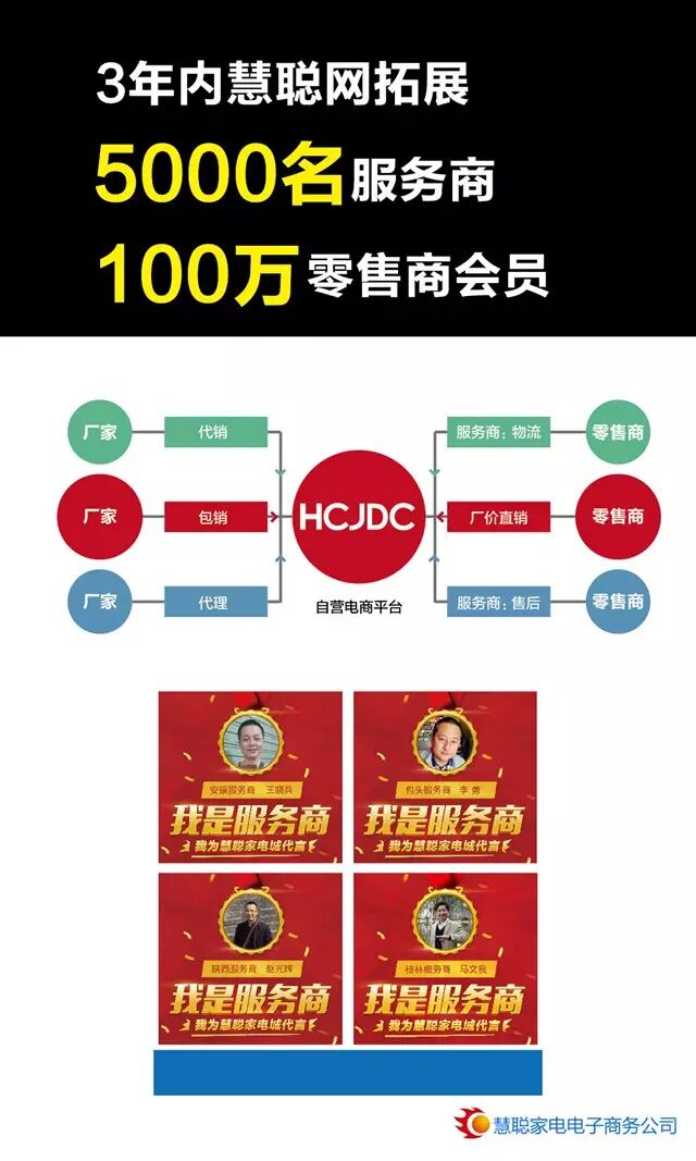 线上慧聪家电城是慧聪转型互联网B2B2.0时代的重要举措,通过零售商集采,打破家电传统代理模式,节省零售商的采购成本。3年内实现全国5000名区域服务商、100万采购商会员, 10万SKU、月均10亿GMV的目标。5000+100万,线上慧聪家电城未来三年计划启动
