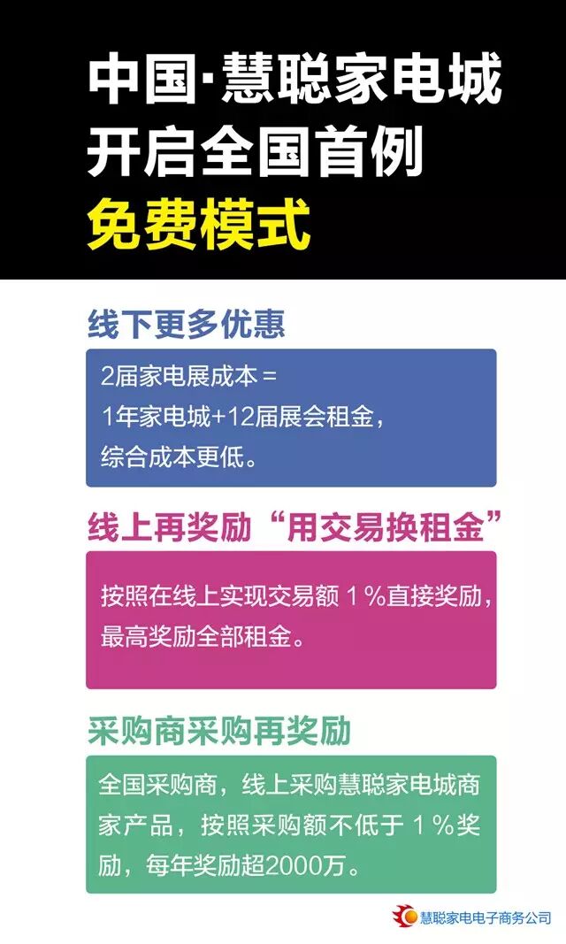 进驻慧聪家电城的家电企业实现慧聪家电城线上交易额,即可享受到全免费的扶持政策,具体包括:慧聪网开启全国首例全免费扶持模式