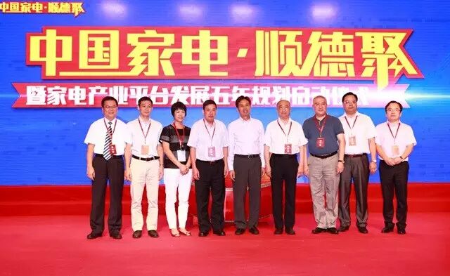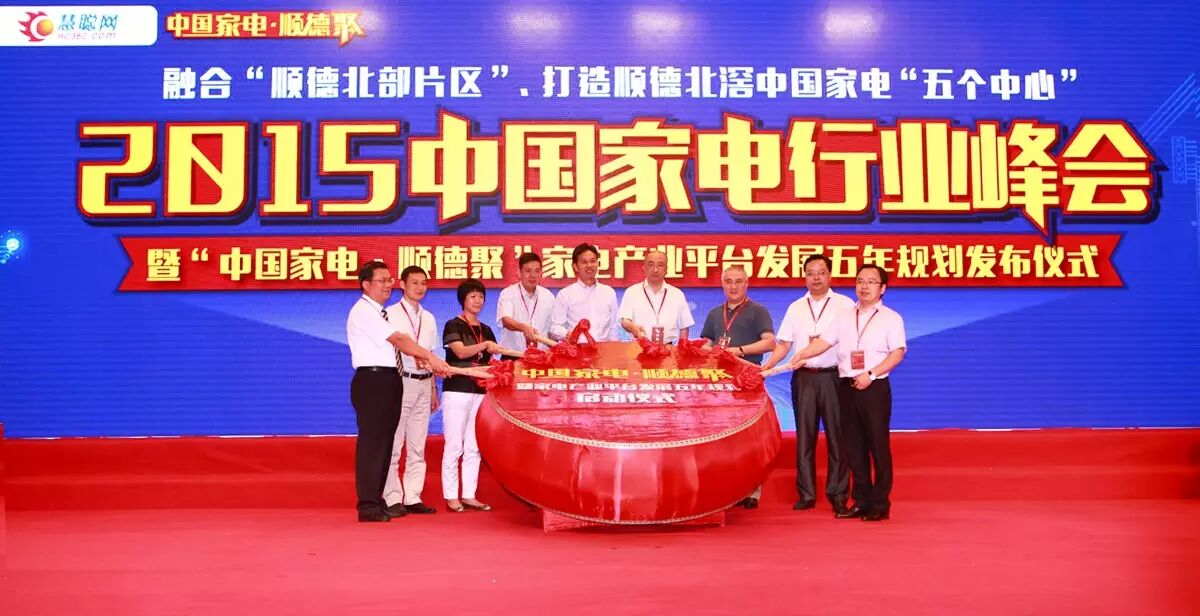 (佛山市委常委、顺德区委书记区邦敏、中国家电协会副秘书长陈钢、广东省家电商会秘书长谢德盛、顺德区经济和科技促进局局长招霞红、顺德区北滘镇党委书记罗厚光、顺德区北滘镇镇长余焯焜、顺德控股董事长李文军、顺德农商行董事长姚真勇、中国慧聪家电城董事总经理宋冰晨等领导敲响大鼓,“中国家电·顺德聚”家电产业平台五年规划正式启动)