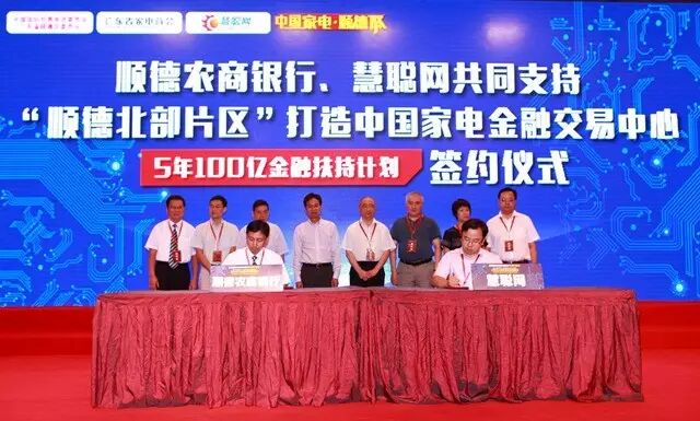 顺德区委书记区邦敏、顺德农商银行董事长姚真勇共同见证,顺德农商银行副行长马列光、慧聪家电城董事总经理宋冰晨签约,中国家电金融交易中心--5年100亿金融扶持计划正式启动。