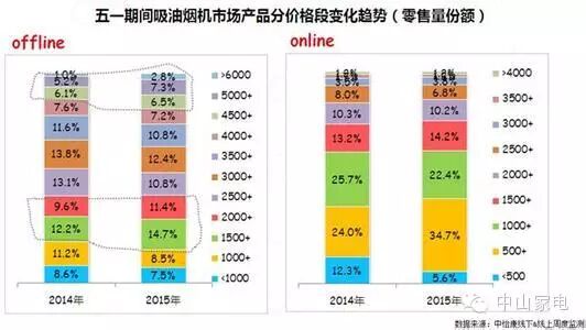 就价格来看,线上与线下价格背道而驰。据中怡康线上、线下监测数据显示,2015年五一期间,油烟机线下市场均价有所上升,同比增长为5.1%;线上市场均价则同比下滑1.8%。从价格段分布来看,线下中端及4500+价格段市场份额有明显上升。据中怡康线上、线下监测数据显示,五一期间,油烟机线下市场,1500元—2500元价格段零售量份额26.1%,较去年同期增长4.3个百分点;4500元以上零售量份额16.6%,较去年同期增长4.3个百分点。线上与线下相比较依然处于较低端,1500元—2500元价格段零售量份额57.1%,仍保持强劲的增长势头,4500元以上零售量不足2%,且增长缓慢。