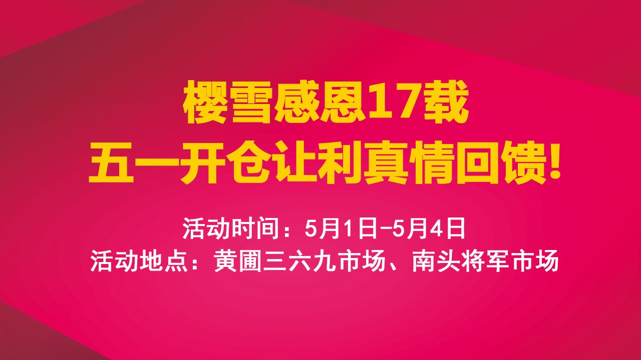 感恩十七载,樱雪五一开仓让利真情回馈!5月1日至5月4日火爆开仓!黄圃三六九市场...