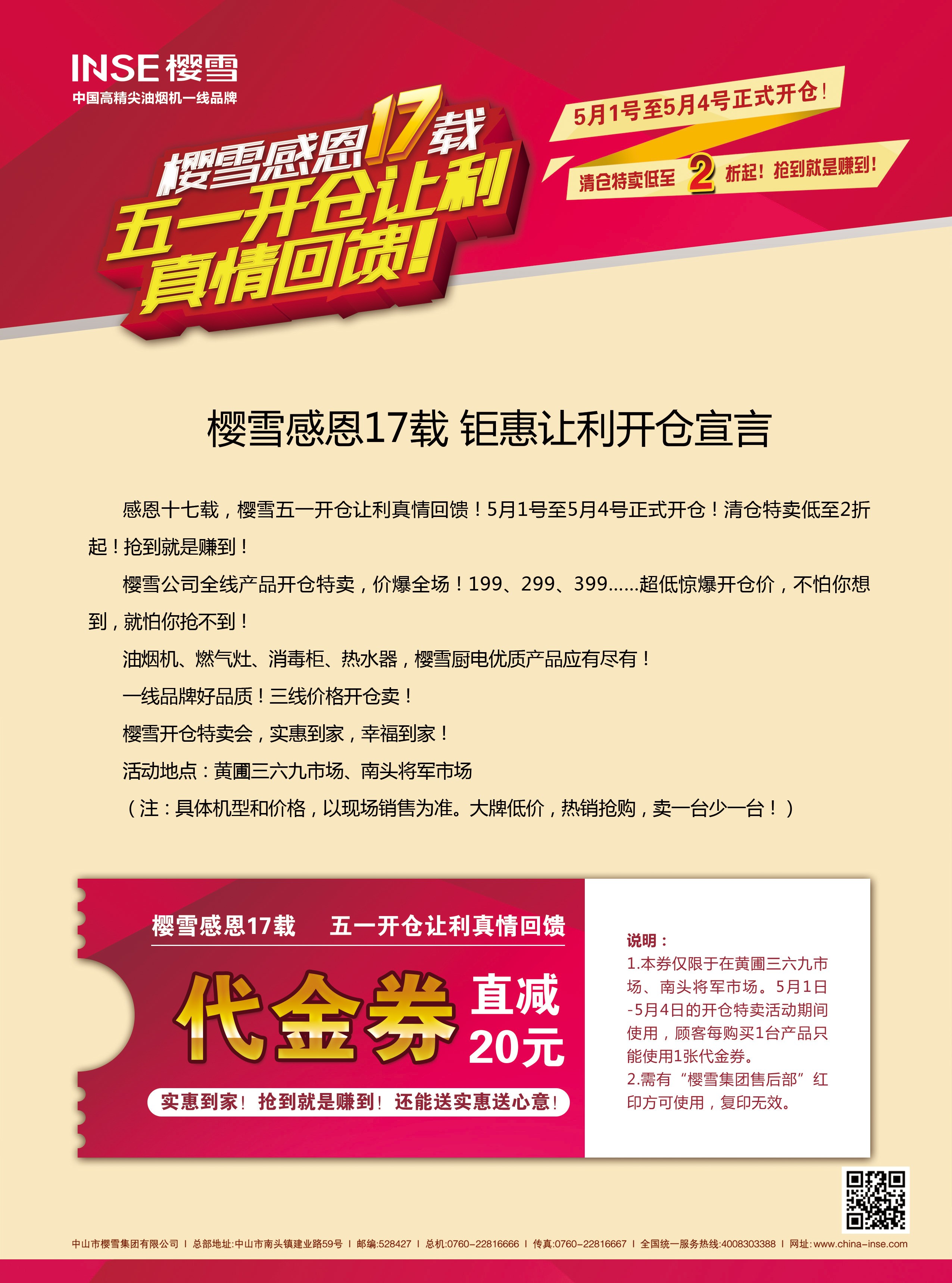 从4月29日起,樱雪集团宣传小队将在黄圃三六九市场和南头将军市场派发活动专项宣传单,活动宣传单上附有超值代金券,5月1日-5月4日的开仓特卖活动期间,拥有优惠劵的顾客,持优惠劵到现场购买产品,即可直减20元。(顾客每购买一台产品只能使用一张代金券)