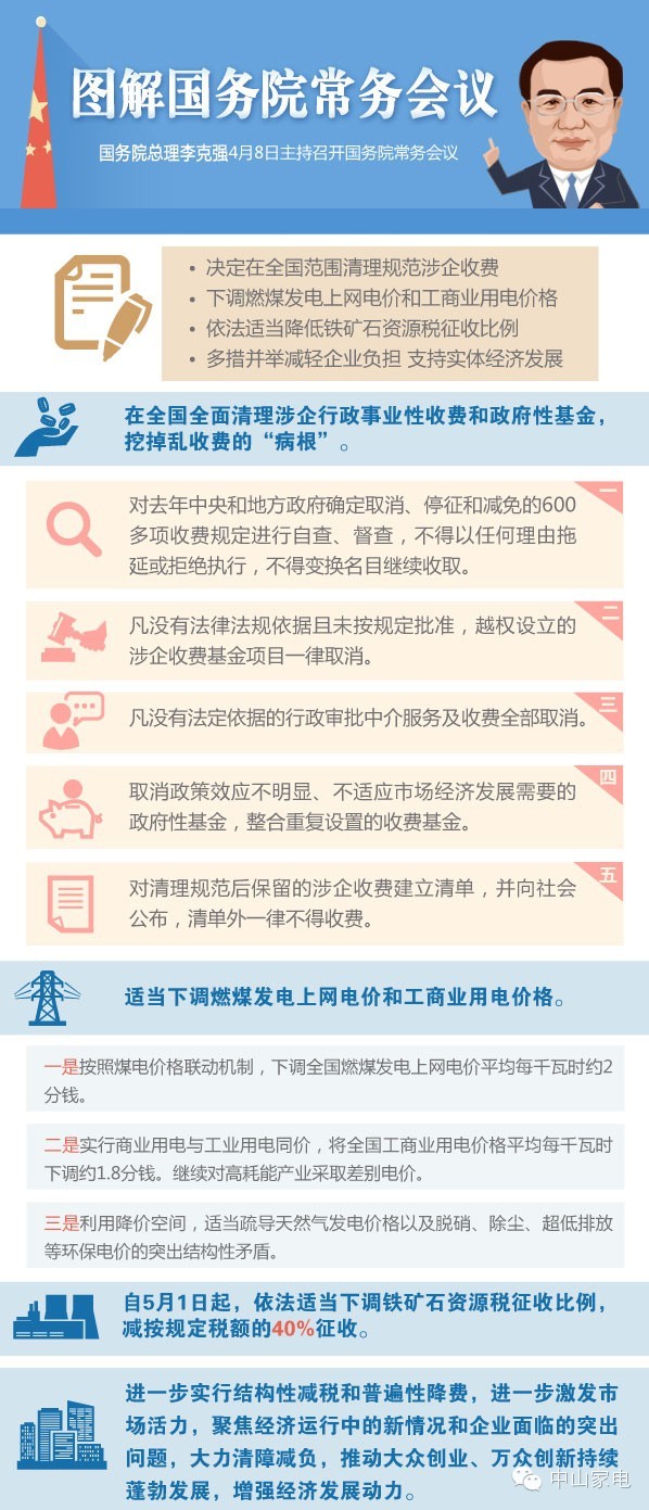 4月8日的国务院常务会议上,三个议题围绕同一条主线展开--减税降费、减轻企业负担、支持实体经济发展。在全国范围清理规范涉企收费、下调燃煤发电上网电价和工商业用电价格,依法适当降低铁矿石资源税征收比例。 在全国范围清理规范涉企收费、下调燃煤发电上网电价和工商业用电价格,依法适当降低铁矿石资源税征收比例。 4月8日的国务院常务会议上,三个议题围绕同一条主线展开--减税降费、减轻企业负担、支持实体经济发展。 在中国经济下行压力较大的情况下,这样的安排绝非巧合。轻徭薄赋、与民休息,自古以来被视为时务之要。在李克强任上,这种“以减法换乘法”的治理思路尤其清晰。 过去两年多时间里,他多次强调要通过减免税负帮助中国经济爬坡过坎。一个可供佐证的数据是,2014年通过“降税减费”对小微企业的支持达到1000多亿元。 在刚刚结束的这次常务会上,减负的对象进一步扩围,不仅剑指困扰企业的“任性”收费,更意图通过下调燃煤发电上网电价和工商业用电价在成本端为企业减负。 8日的会上还释放了一个重要信号,在谈及全面清理规范涉企收费议题时,李克强称其为“实施积极财政政策的有力措施”。 值得玩味的是,这是继2月25日的国务院常务会议后,李克强总理第二次公开诠释“减税降费”与“积极财政政策”之间的关系。 这两次表态很重要。在传统观念里,一提到积极财政政策,很容易让人马上联想到增加赤字,拿出钱投资公共产品和公共服务建设。当然,这也是必要的。然而对于那些更广大的市场主体而言,少取之,便是予之。一解就业,二促创新,三能传递清晰的政策导向,这又何尝不是一种积极的财政政策? 知易行难,许多国家的财政政策都面临着这样的悖论:政府往往在经济形势向好、财政盈余时更乐于减税降费,而在经济不景气、财政捉襟见肘时则明显缺少动力。但对于企业经营者而言,越是在后一种形势下,减税降费的政策才越能最大化地发挥“及时雨”的功效。 在经济面临下行压力的情况下,这是个两难选择。但李克强显然知道中国经济的活力与韧性到底在哪里。 而要盘活中国经济这盘大棋,“四两拨千斤”的财政无疑是最重要的宏观政策工具之一。这其中,决不能仅仅依靠扩大公共产品的供给来“保驾护航”。 这就是李克强为什么将“减税降费”称为“积极财政政策”的真正原因。(来源: 新京报)