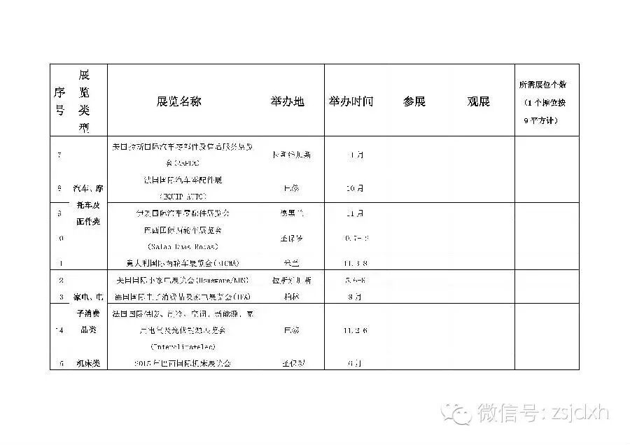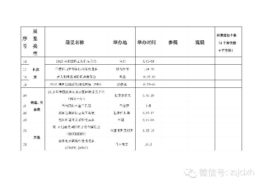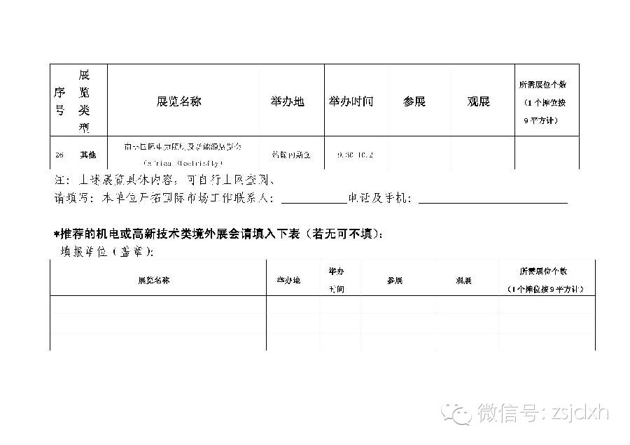 一、省机电办对我省相关企业参展意愿较强的境外展览进行了汇总并形成清单(见附件),现征求会员企业的参展意愿,填报有关需求情况。省机电办将根据参展企业数、所需展位数等指标,确定2015年境外展览计划。