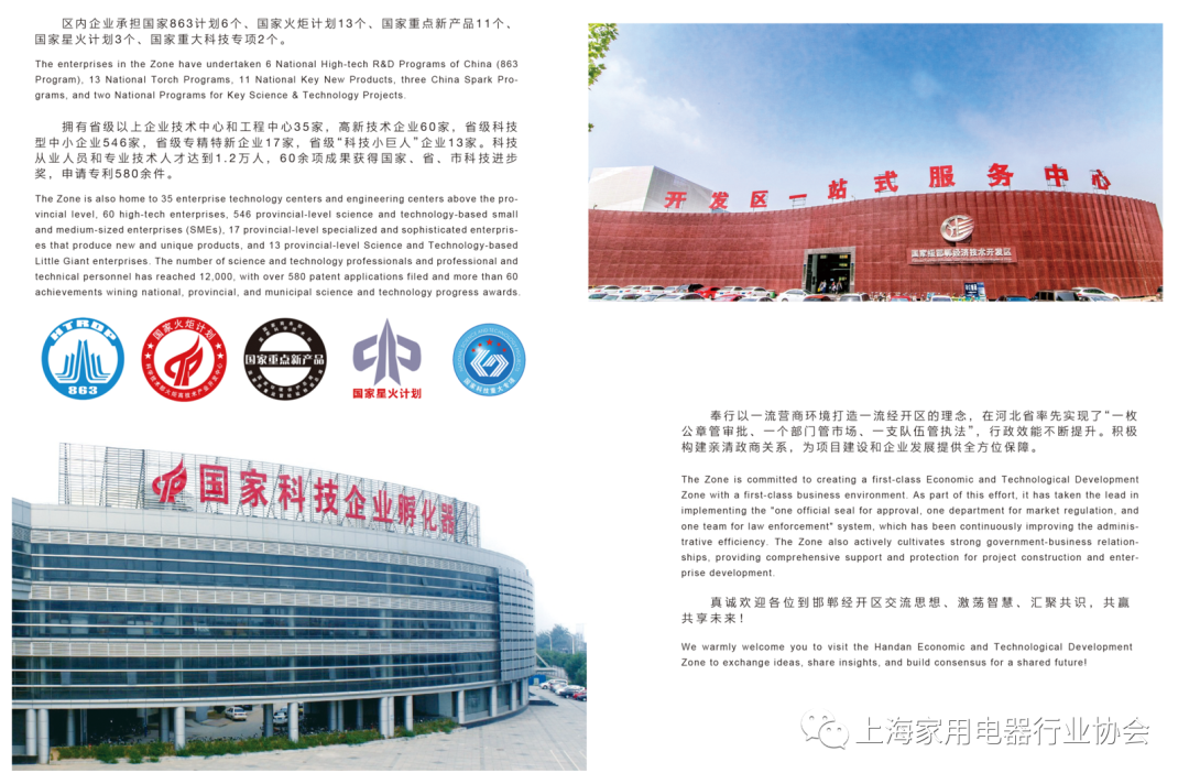 这里产业兴旺,是投资发展的新洼地。近年来,邯郸经开区大力发展战略性新兴产业,形成了高端白色家电、高端装备制造、新能源、新材料“两高两新”四大主导产业,先后引进了美的集团、吉利集团、中国船舶、新兴际华、中建材、中钢研、法国圣戈班、德国西门子、荷兰哈克、美国海兰等一批全球500强、国际知名企业和央企国企,发展势头强劲。一是美的在邯发展迅猛。2010年美的北上选择邯郸经开区,投资50亿元建设了空调工业园,一举填补了邯郸市乃至河北省白色家电产业的空白。历经10余载春夏秋冬,产能产值大幅跃升,年产空调达到855万台套,年产值达到159亿元,成为邯郸首家超百亿元的轻工业企业、美的集团北方最大的白色家电生产基地。基于邯郸经开区与美的集团的良好合作基础,2021年5月,美的集团总投资50亿元的智能厨电产业园落户邯郸经开区,并实现当年签约、当年开工、当年投产,进一步丰富了白色家电产品种类。目前,集成灶、热水器生产线产能达到206万台套,年产值15亿元,已满产运行。经开区正在与美的集团积极沟通,加快推动美的厨电产品扩能提升并尽快启动二期项目建设,进一步做大做强。二是配套产业规模初显。一个龙头企业带动一条产业链。在美的空调工业园和美的智能厨电产业园的带动下,涉及钣金、注塑、电子元器件、包装等行业的30余家家电配套项目落户邯郸,形成了比较完整的白色家电产业集群。河北省委书记倪岳峰、省长王正谱在邯郸经开区调研时,明确提出“加速白色家电配套企业本地化,做大做强做优产业集群”。为落实省委、省政府主要领导指示要求,我们已整合现有4万平米厂房,用于引进白色家电配套项目;同时,新规划用地140亩,加快实施总建筑面积14万平方米的美的配套产业园。力争“十四五”期间再引进20-30家一级配套商,带动压缩机、电机、芯片、变压器、面板等核心配套产业发展,加速形成超百亿级的白色家电配套产业集群。三是营商环境十分优越。坚持软环境、硬环境两手抓、两手硬。在软环境上,成立了项目帮扶工作领导小组,秉承“全天候、不打烊”服务理念,积极开展延时服务、错时办理、加急审核,确保项目建设无障碍、零停留。同时建立帮扶帮办、服务承诺、一线办公、信息直通、奖优罚劣等工作机制,为企业和项目提供高效便捷的服务。特别是帮助美的创造应用场景,当地相关市场优先采购美的产品,并利用五一黄金周有利时机,市区两级积极为美的量身制定了家电产品销售补贴政策,全面助力企业拓展市场、做大做强。在硬环境上,坚持标本兼治,投资近10亿元完成基础设施改造提升和滏阳河全域生态修复,彻底解决了困扰企业发展的内涝问题。全面完善水、电、路、气、暖、讯等基础体系,帮助美的邯郸公司将水费由每吨9.58元降至6元,同时正在谋划实施自建水厂,将进一步降低水费至每吨2元左右。气源优化、热源置换、沟渠连通、蓝领公寓、人才公寓、EOD、医院、学校等一大批配套设施正在持续完善,全力以赴为企业提供要素保障,降低经营成本,提升综合竞争力。这里政通人和,是创新创业的新福地。古来商贾汇中原,未来商机聚经开。邯郸经开区将抢抓发展战略机遇,加快建设高能级创新策源地、高水平开放主阵地、高质量发展示范区、高品质宜居新城区,全力打造投资创业首选地。真诚欢迎各位企业家朋友前来考察对接、洽谈投资,共商发展大计,共创美好未来。我们将以最大的诚意、最优的环境、最好的服务,为实现共赢发展提供最坚实的保障。