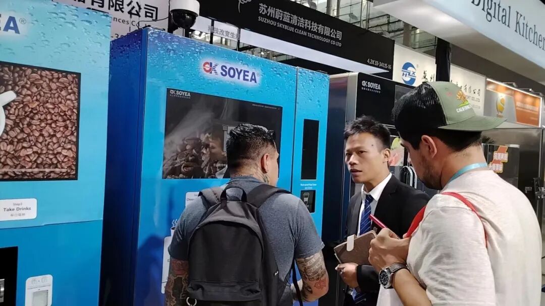 在展会现场,络绎不绝的海外采购商被"味霸"机器人厨师烹饪的菜香吸引而来,他们成群的聚集在索伊展厅周围驻足观看,目睹了"味霸"烹饪机器人烹饪的全过程,索伊国际业务团队讲解员和业务人员为客商答疑解惑。他们了解"味霸"机器人厨师不仅菜做的好,还能自动添加佐料、无油烟、无明火、全自动洗锅等诸多优点,部分客商亲自品尝了"焗鸡翅,炒河粉"等,对菜品的口感、味道、色泽和烹饪的火候赞不绝口,纷纷竖起了大姆指,连连称赞,并与索伊国际营销人员互留联系方式寻求对产品的进一步了解和深层次的合作,外商们现场还品尝了智能化数字咖啡饮料机现磨的咖啡。