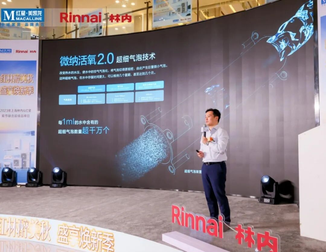 上海林内有限公司营业本部营销部部长薛晓斌介绍了两款新品的技术创新,他说道:“林内氧霂Pro系列产品搭载了日本同步技术微纳活氧2.0,每1毫升水中含有千万个超细气泡,能在沐浴和清洗果蔬时有效减少细菌、去除餐具油污,让洗浴更放松,清洁更轻松,给业主带来全新的用水体验。”