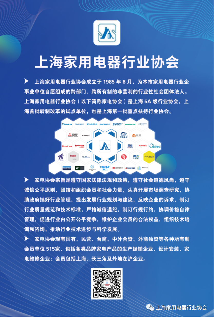 [温馨提示] 文章来源于上海家用电器行业协会公众号,转载注明原文出处,此文观点与查生意无关,理性阅读,版权属于原作者若无意侵犯媒体或个人知识产权,请联系我们,本站将在第一时间删掉 ,查生意仅提供信息存储空间服务。