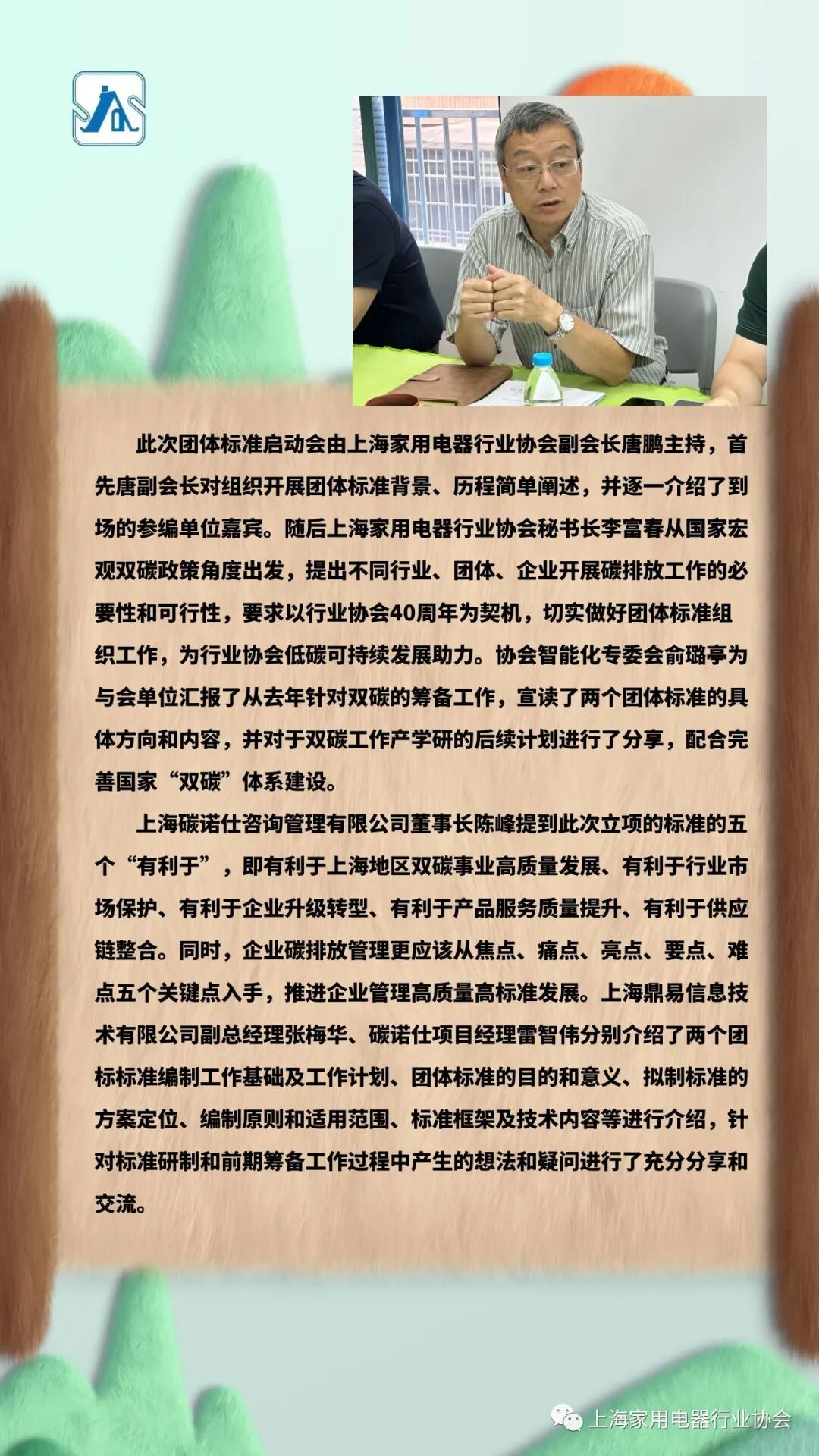 、《家用电器及消费电子企业碳排放评价办法》团体标准启动会顺利召开2023年08月30日,由上海家用电器行业协会、上海鼎易信息技术有限公司、上海碳诺仕咨询管理有限公司牵头编制的《家用电器及消费电子产品和服务碳排放评价办法》(T/SHJD 001-2023)、《家用电器及消费电子企业碳排放评价办法》(T/SHJD 002-2023)团体标准启动工作会议在上海家用电器行业协会召开。来自开能健康科技、能率、林内、瑞美、梦地、康丽根、大金、双鹿、汉斯希尔、泽天、梵沫、利洋、腾灵集团、博汉建设、日郸机电、当涂县驻沪办、中国质量认证中心、复旦等30多位代表参加了会议。