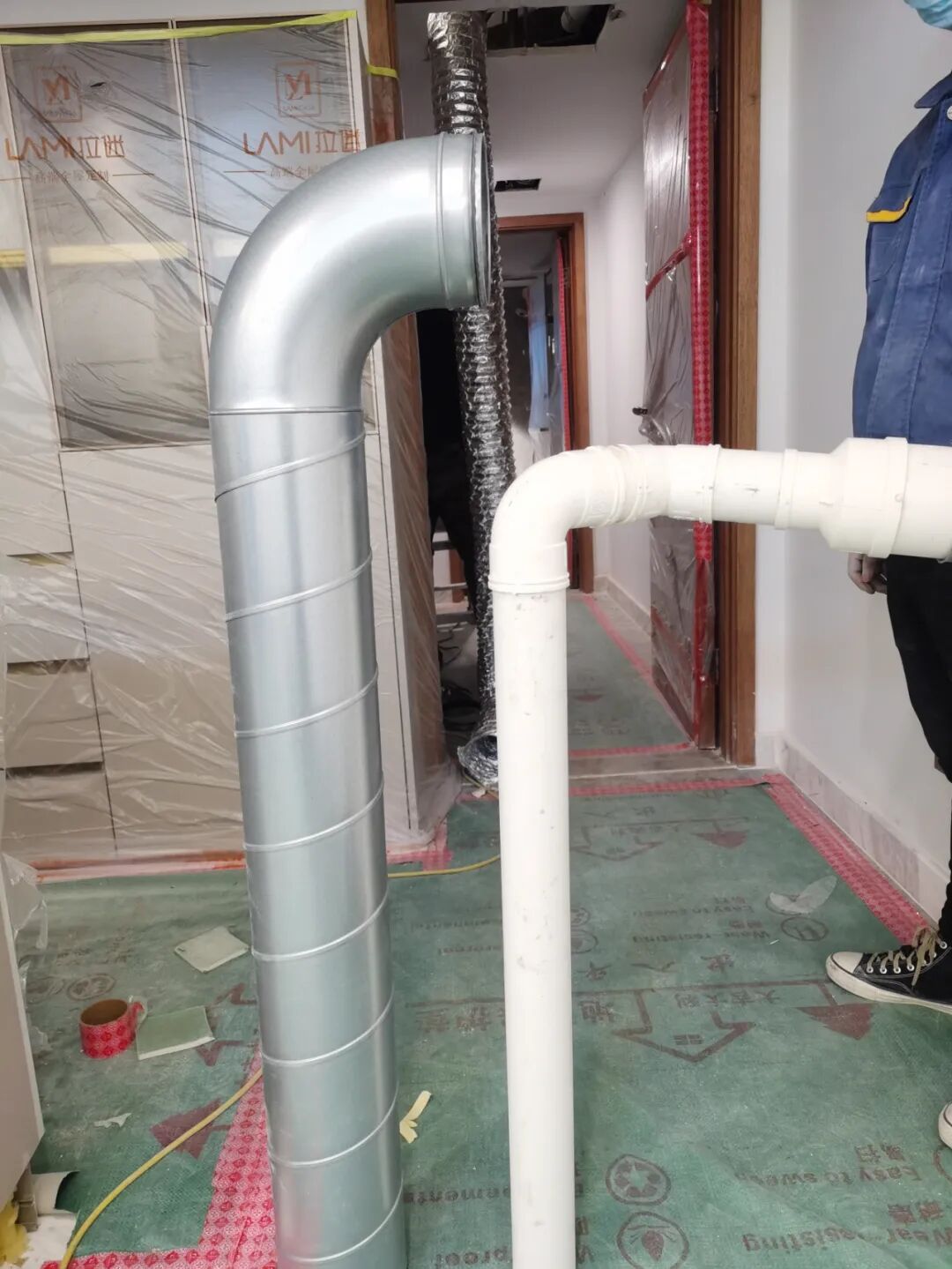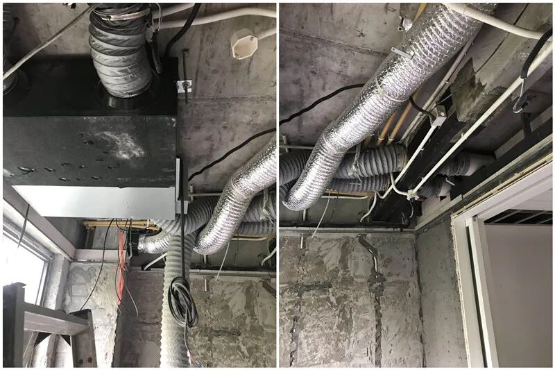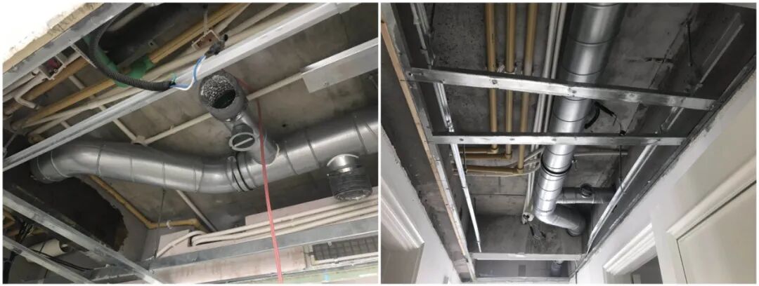 (风管辅材&设计不合格,施工很乱,管道太长、拐弯太多、弯头角度过小)