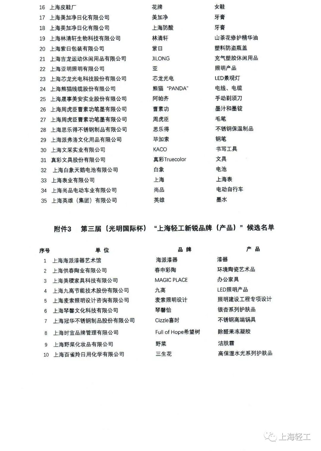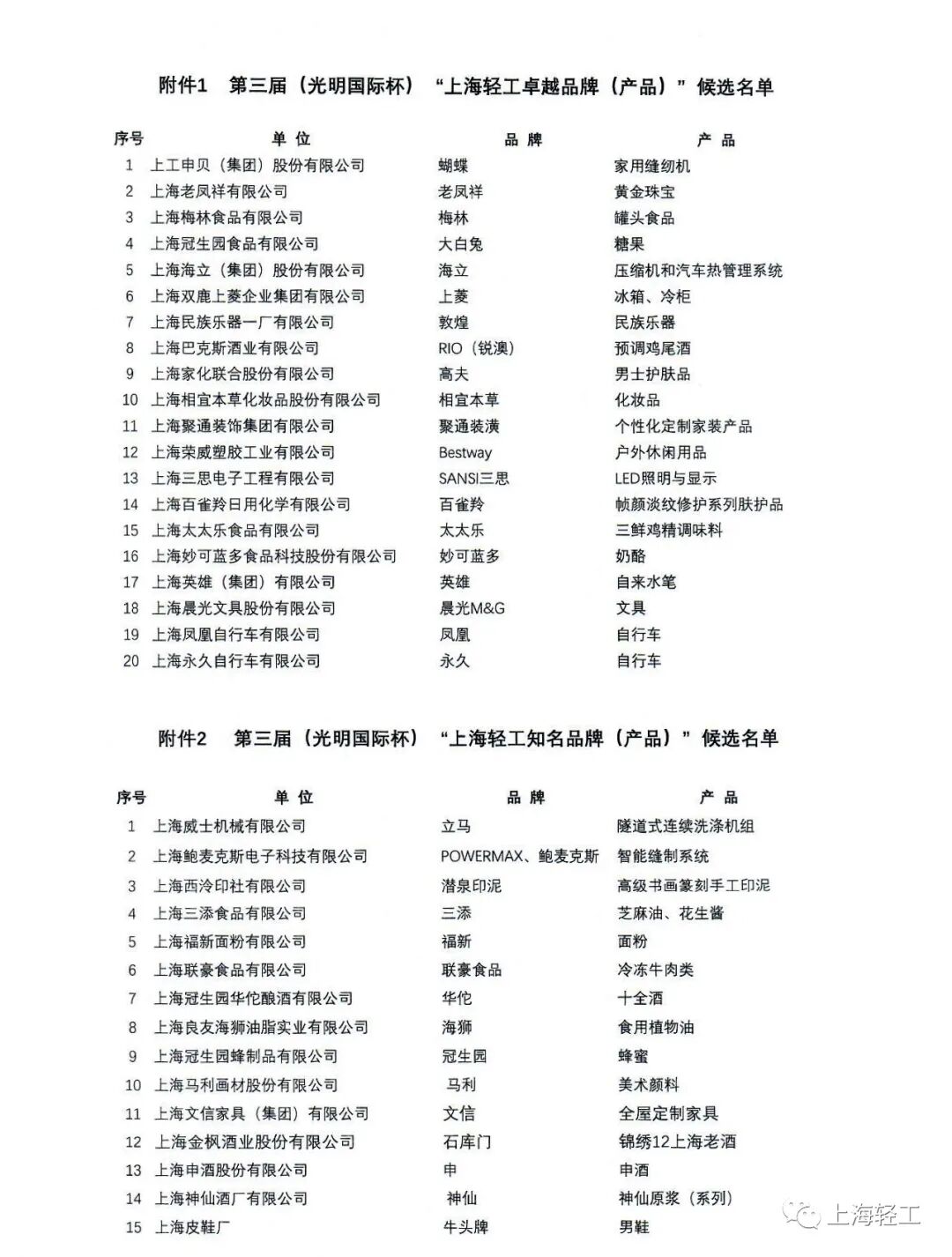 第三届(光明国际杯)“上海轻工卓越、知名、新锐品牌(产品)”候选名单公示