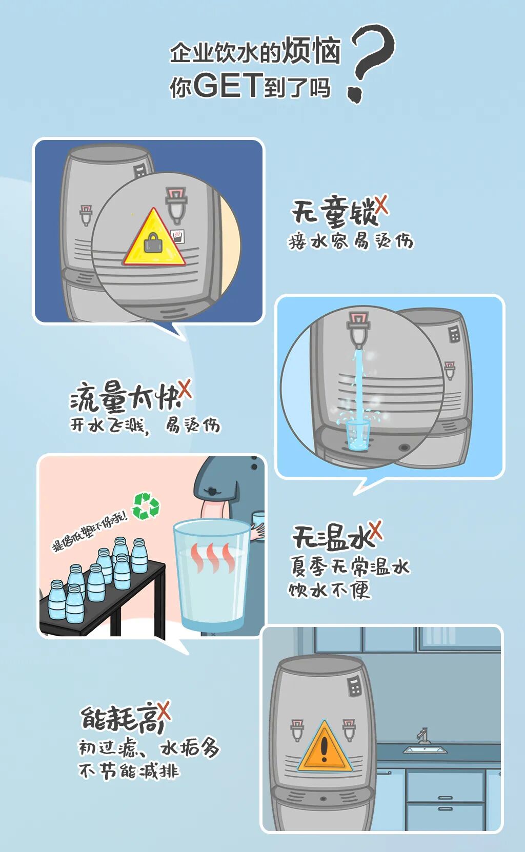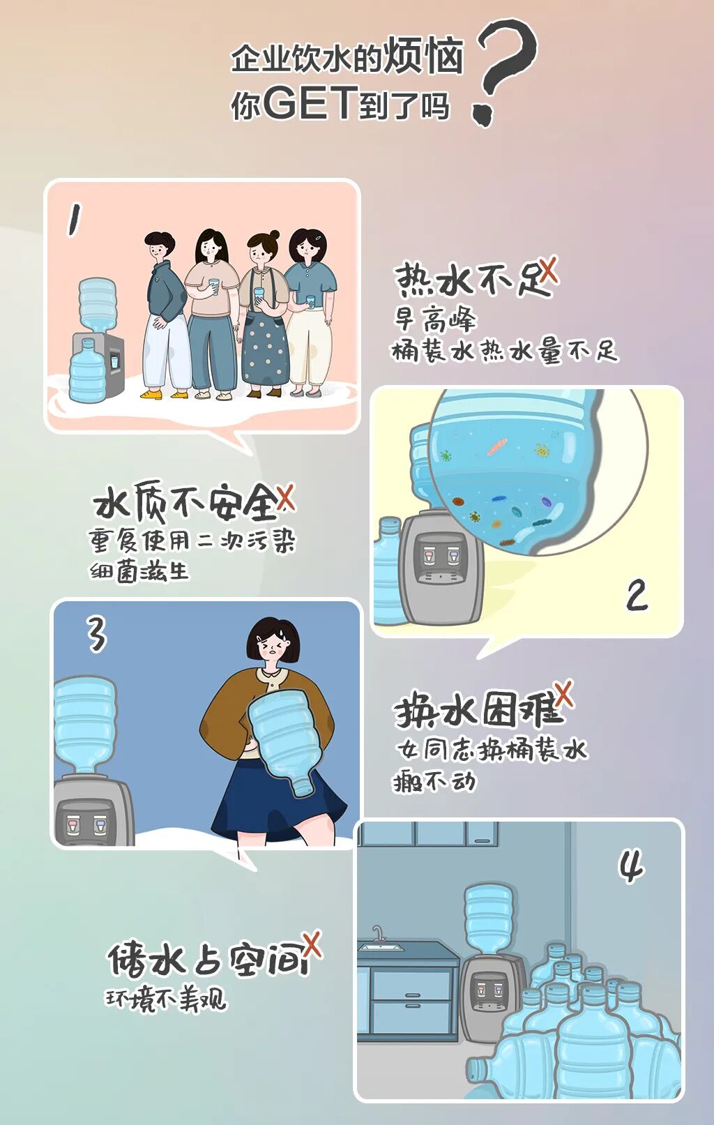 以往企业办公场景中通常采用的是桶装水或者开水器,这种传统的饮水方式久而久之也给设备管理者和使用者带来了许多烦恼——