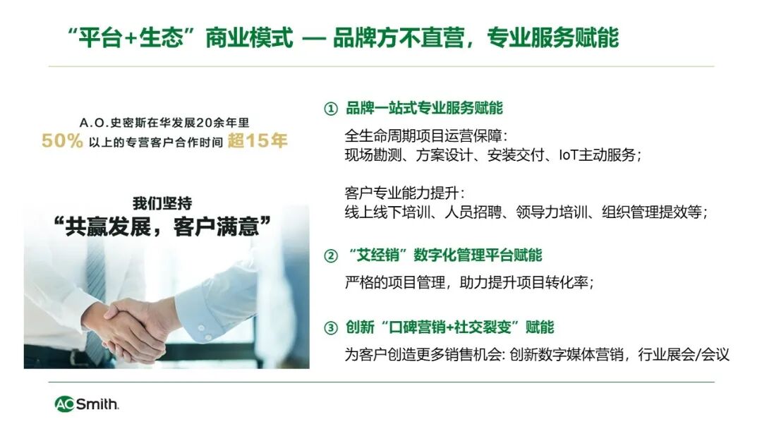 当下商用净水行业的景气度,正如过去25年前的OA办公行业。在如此蓝海的百亿级市场里,A.O.史密斯一直以高速增长的态势稳步发展。卓越业绩的背后,离不开高质量经销商客户的支持。通过品牌影响力及专业营销队伍的打造,A.O.史密斯始终坚持品牌方不直营,可租可售、专业服务赋能合作伙伴取得商业成功。在A.O.史密斯商用净水平台上,OA行业的合作伙伴只需聚焦优势渠道,跨界不跨行,让生意更简单。