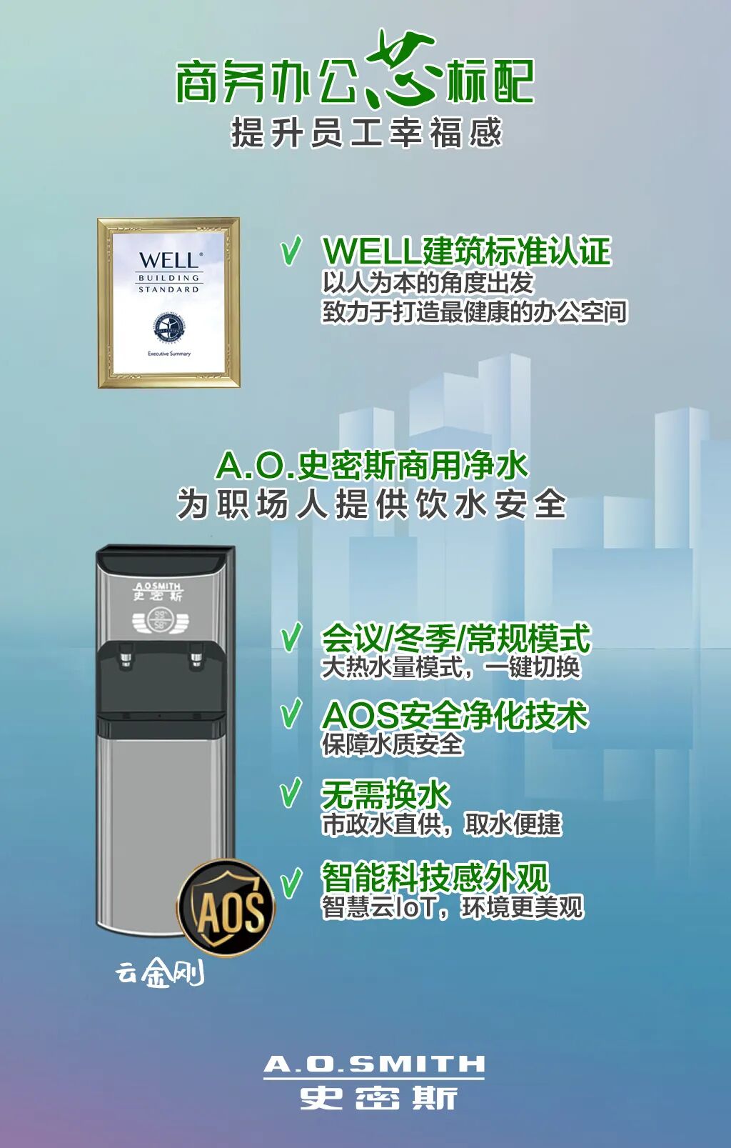截至目前,A.O.史密斯商用净水已入驻40%以上世界500强中国区职场、40余个国际机场、6大国际权威检测机构等等,为全国10万余家企事业单位及公共场所提供了安全、便捷的直饮水服务,未来A.O.史密斯商用净水将联动OA办公圈的同仁为更多的办公场景提供全方位、一站式的服务保障,共建健康办公新生态。