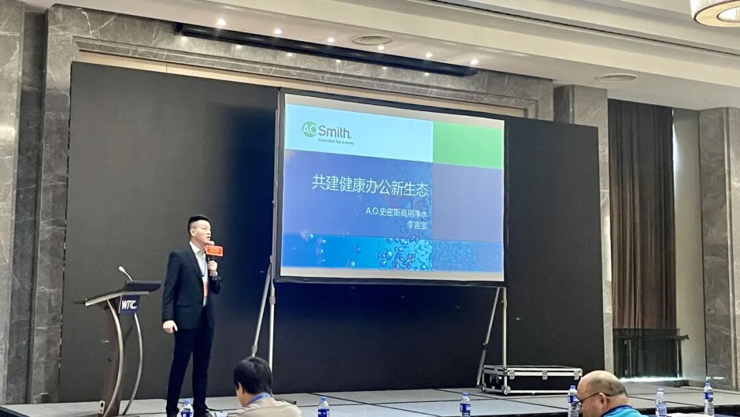 在分会议环节中,A.O.史密斯还以“共建健康办公新生态”为主题作了汇报分享,涉及“商用场景饮水现状”、“商用净水市场前景与机会点”、“企事业单位饮水升级方案”和“为什么选择A.O.史密斯”这四大版块内容,旨在携手OA行业同仁一起为终端用户打造一个安全、健康、智慧、便捷的办公新生态系统。