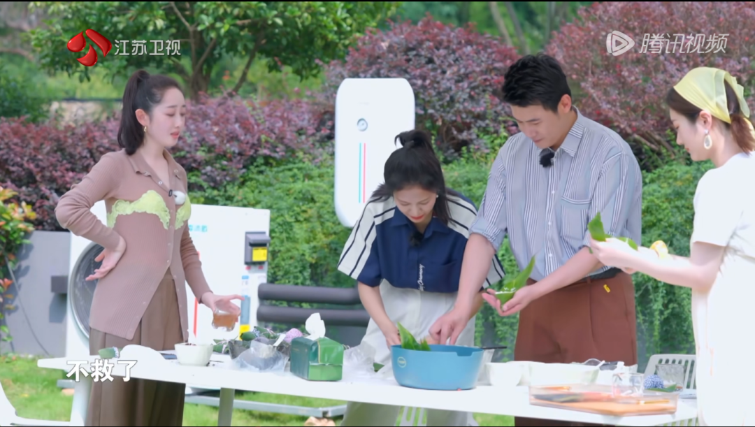 鲍蕾好不容易探索出包粽子的诀窍,一边包一边兴奋地说着成了。陆毅却故意开损:你别嘴硬。鲍蕾:属鸟的,就嘴硬。
