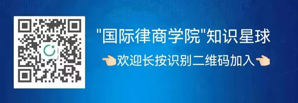 “国际律商学院”知识星球是专注于国际法律和商务实务的专业知识共享平台、实务教育培训平台、实务问答互动社区、和涉外法律数据库。在线实务问答,参加视频课程,加入微信交流群,获取更多法律实务干货、中英文合同模板、深度研究报告、法律风险预警周刊、重大文件翻译、实务学习资料、VIP会员特权等,欢迎长按或扫描下面二维码加入我们的“国际律商学院”知识星球!