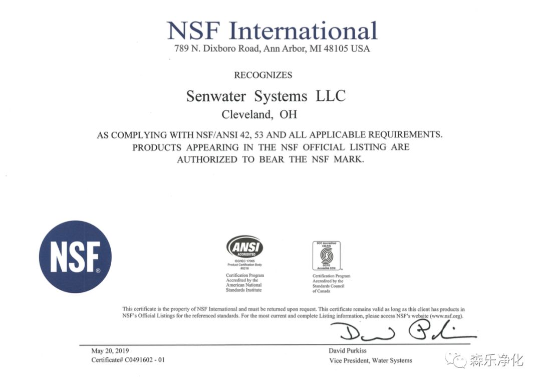 森乐QCS系列产品通过专业的NSF42& 53双认证