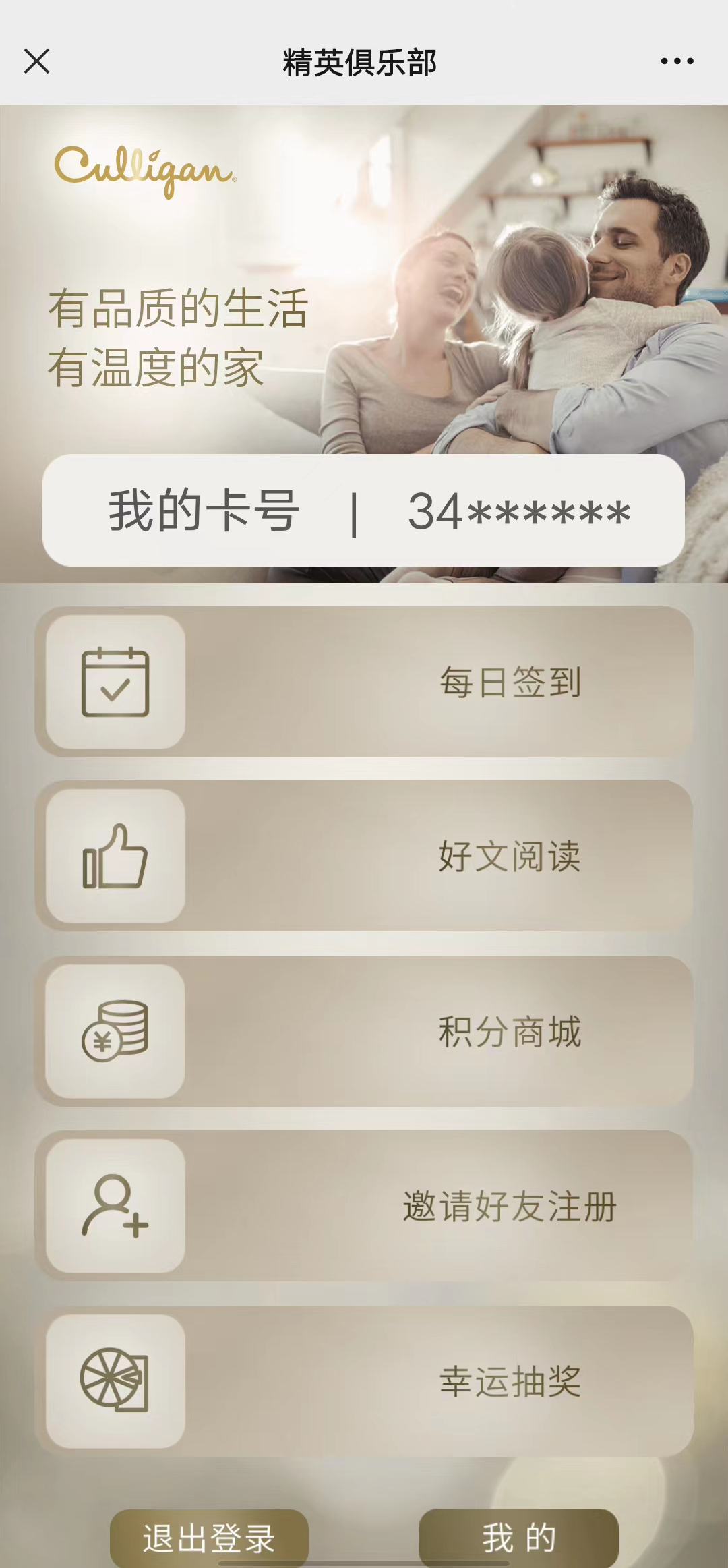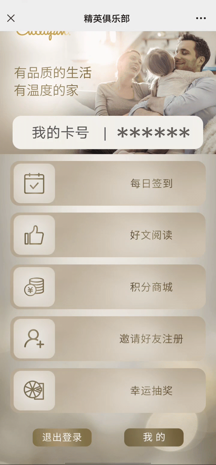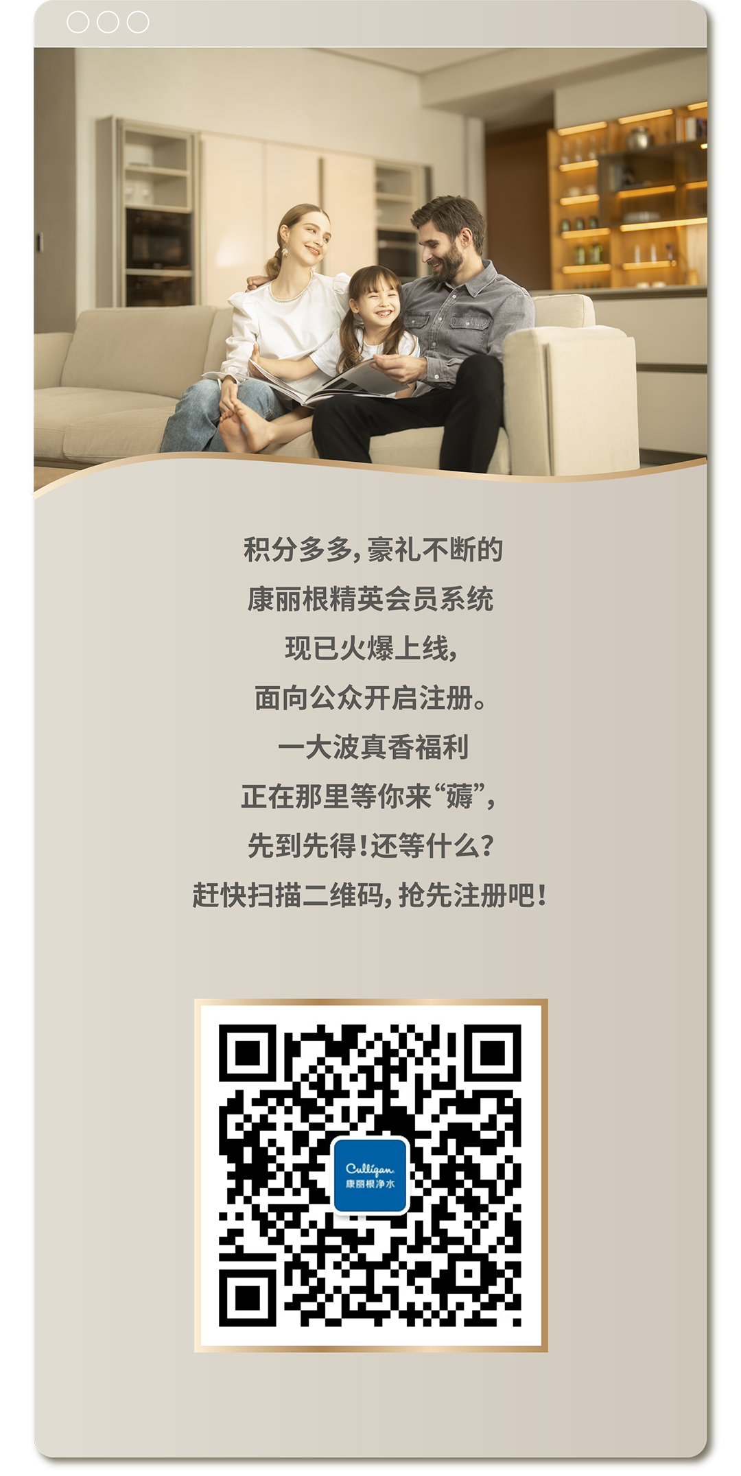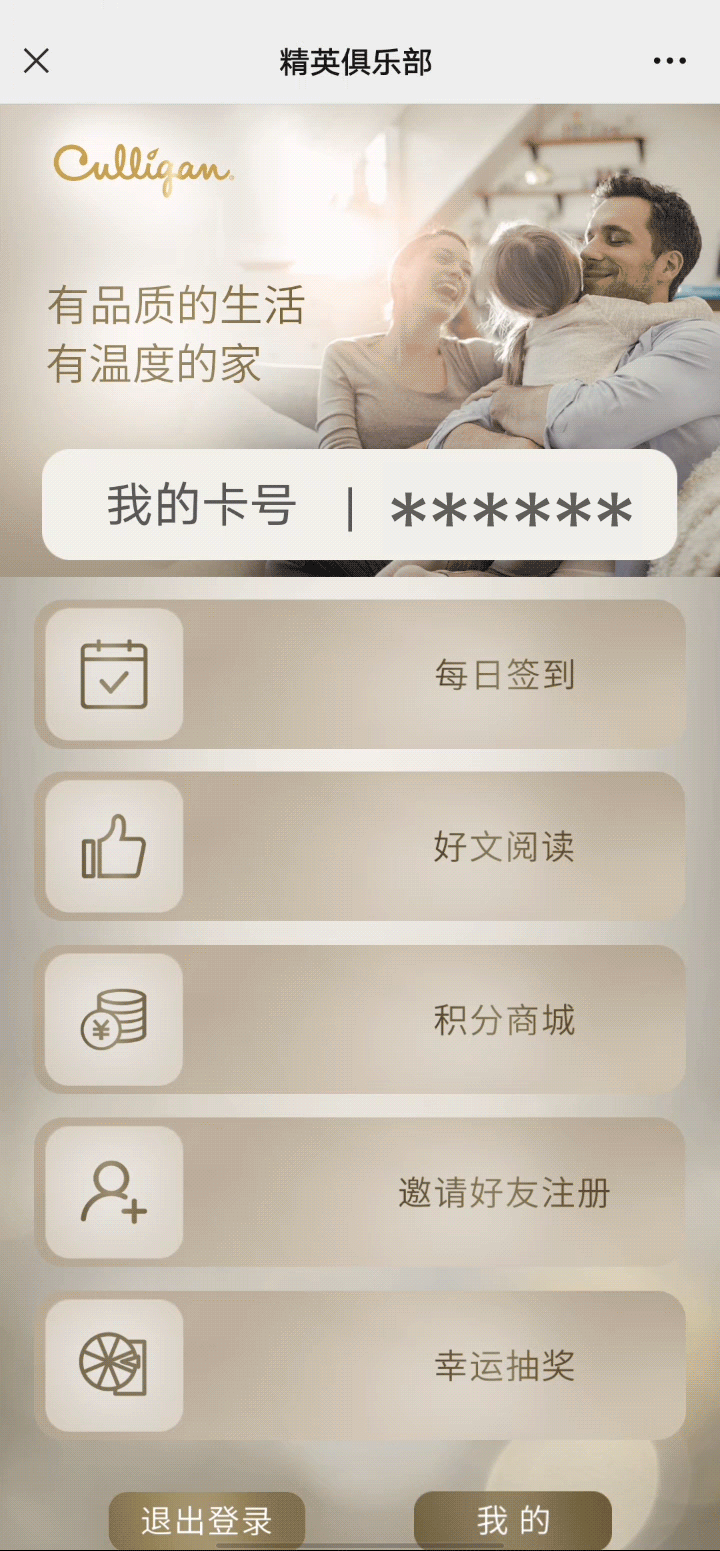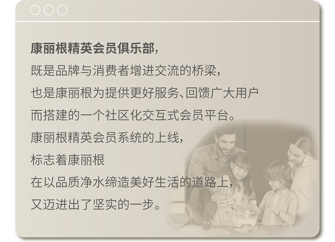 注册康丽根精英会员,加入康丽根精英俱乐部,不仅可以更好的了解净水科学、品质生活以及康丽根品牌最新动态,更重要的是:可以通过每日签到、阅读好文、邀请好友等互动操作获得积分,兑换各种时尚又实用的会员礼品。