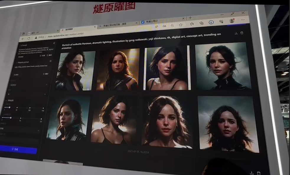 在商汤科技展区现场可以看到其文生图创作平台“秒画SenseMirage”,该平台是一个包含商汤自研AIGC大模型和便捷的LoRA训练能力,并提供第三方社区开源模型加速推理的创作平台,可以根据图片或文本生成相关的图像内容。平台具有强大的中文理解能力和风格选择,可以用少量提示词生成内容丰富、细节精细的图片结果。