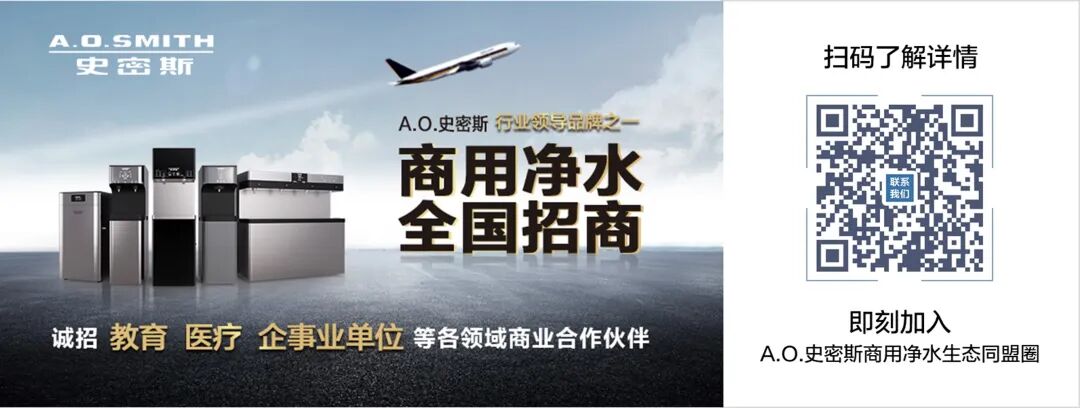 A.O.史密斯作为一个海纳百川的平台,热忱欢迎看好商用净水市场前景的客户成为我们的同道伙伴,A.O.史密斯也将持续通过践行“诚信、创新、致力于客户满意”价值观,提升品牌影响力和好的声誉,从客户需求开始,通过建立信任连接和渠道,快速发展商净业务,为同道伙伴提供公平公正的营商环境,为教育、医疗、企事业单位等更多的人群提供安全、便捷、低塑的饮水服务。