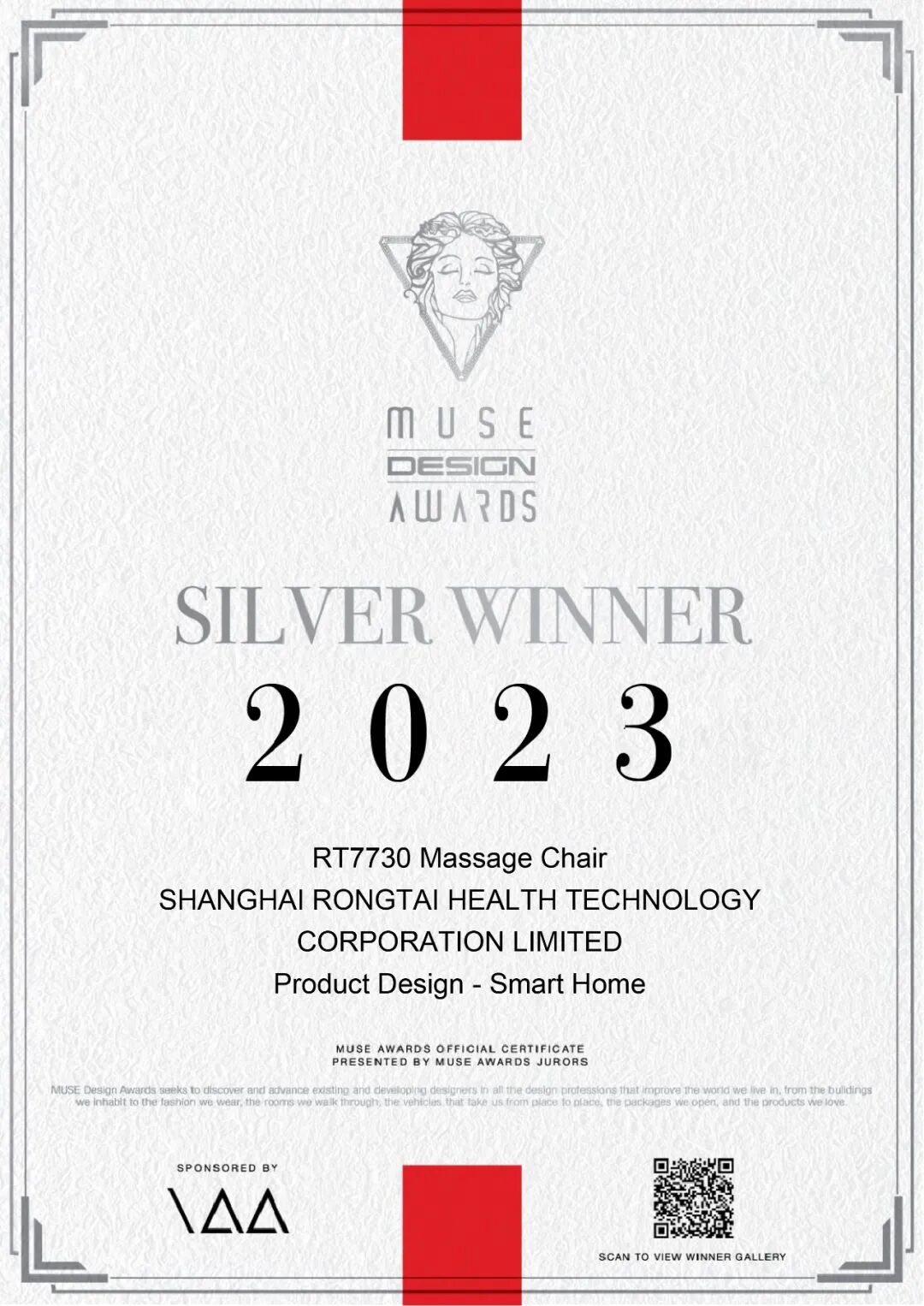此前,RT7730按摩椅已斩获2023年美国缪斯设计奖(MUSE Design Awards)银奖。MUSE Design Awards由国际奖项协会International Awards Associates(IAA)主办,是全球设计领域极具影响力的国际奖项之一。该奖项的获得,已然对RT7730按摩椅产品设计的卓越性和领先性,做出了权威认证。