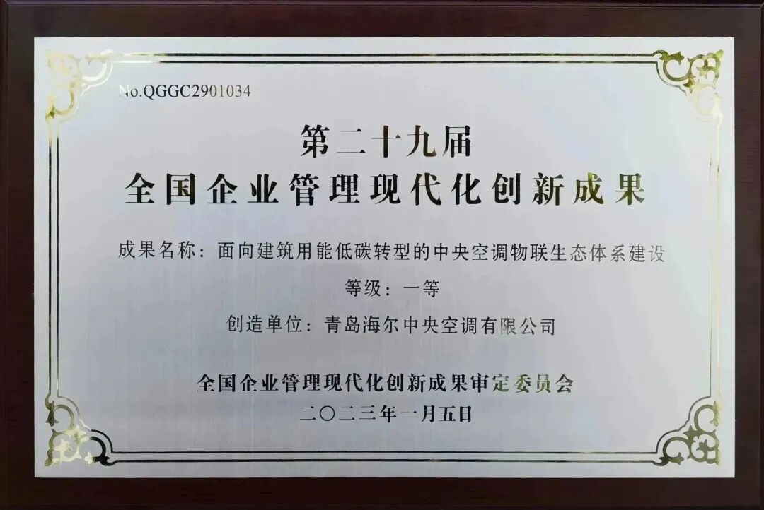 海尔智慧楼宇受邀参会,并凭借《面向建筑用能低碳转型的中央空调物联生态体系建设》,荣膺“第二十九届全国企业管理现代化创新成果一等奖”,成为暖通行业唯一获得国家级管理成果奖项的企业!据悉,该奖项从1991年开始评选,截至本届,海尔已获得全国企业管理现代化创新成果一等奖10项!