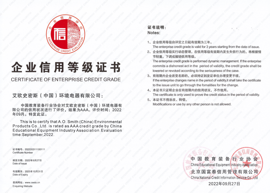 喜讯!A.O.史密斯获评2022年教育装备行业最高企业信用评价AAA级!