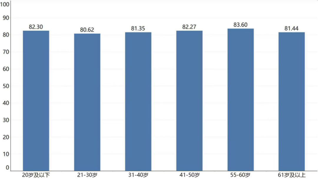 对上海市不同年龄段的消费者满意度得分进行统计,分别为:20周岁及以下82.30分,21-30周岁80.62分,31-40周岁81.35分,41-50周岁82.27分,51-60周岁83.60分,61周岁及以上81.44分。