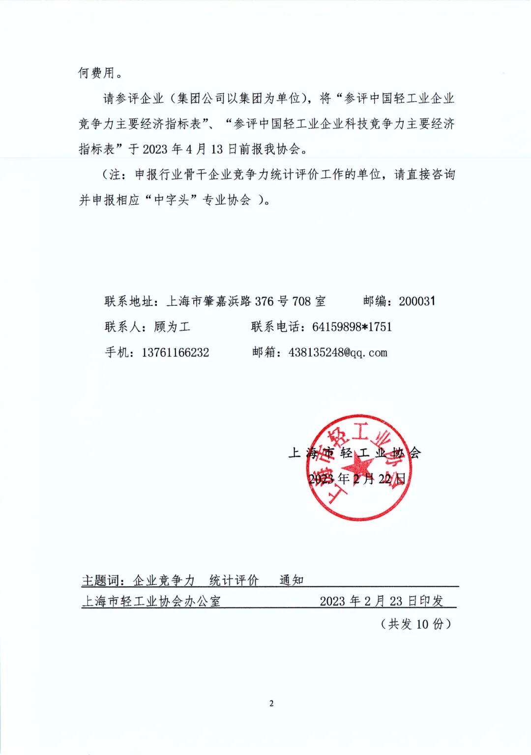 关于开展 2022年度中国轻工业企业竞争力等统计评价工作的通知关于开展 2022年度中国轻工业企业竞争力等统计评价工作的通知