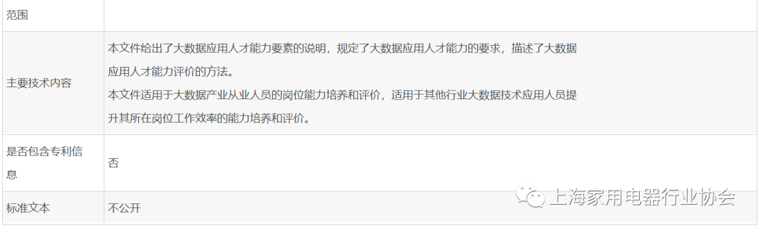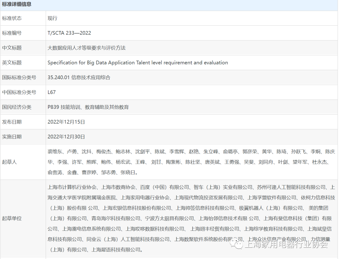 上海家用电器行业协会与上海市计算机行业协会共同参与的T/SCTA 233—2022《大数据应用人才等级要求与评价方法》团体标准遵循开放、公平、透明、协商一致和促进贸易和交流的原则,按照在全国提标准信息平台公布的《标准制定程序文件_SCTA》制定。并在2022年12月30日正式实施。