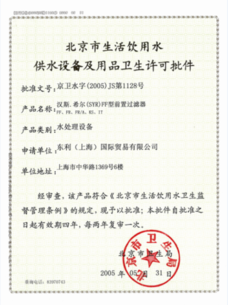 2005年东利科技获得北京市卫生局颁发的水处理行业首张前置过滤品类的卫生批件,领导该品类水处理设备的审批规范化的进程。