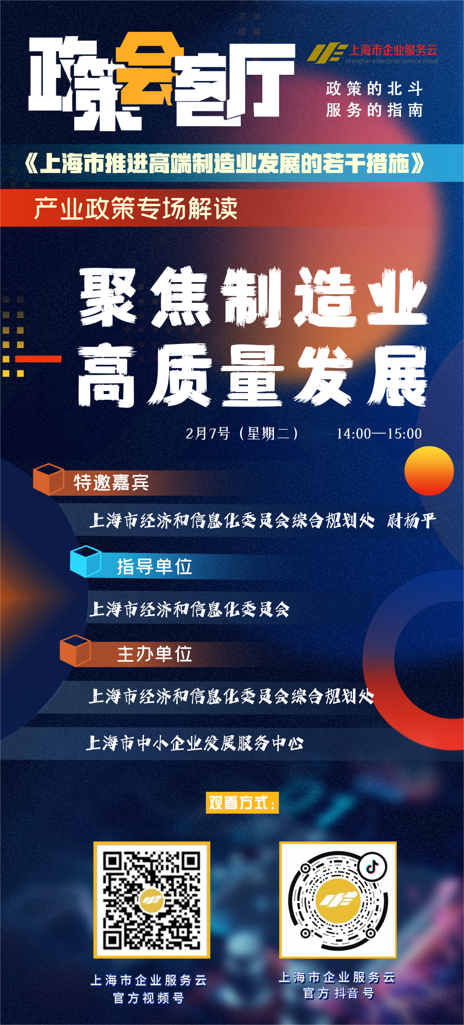 为帮助广大中小企业深入学习《上海市推进高端制造业发展的若干措施》,上海市中小企业发展服务中心(上海市企业服务云)特邀上海市经济和信息化委员会综合规划处解读《上海市推进高端制造业发展的若干措施》。活动通过《政策会客厅》直播栏目举行。