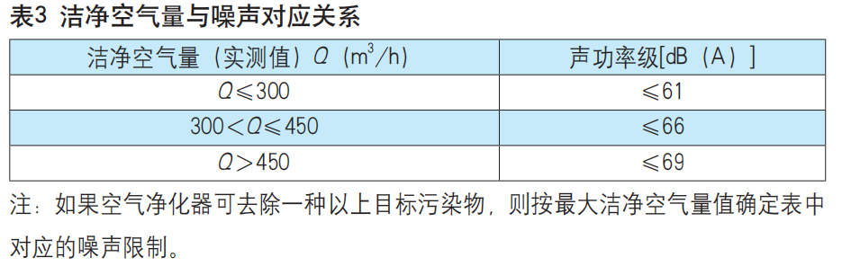 在噪声方面,《空气净化器》新国标则重新规定了洁净空气量与噪声的对应分级(见表3),并增加了“低噪声模式”的相应要求:该模式下最大声功率及工作噪声标称值不应高于38dB(A)。